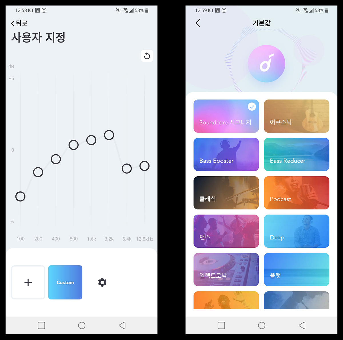 음악 감상은 Soundcore 시그니처, 사용자 EQ 두 가지로 테스트를 했습니다. 다른 기기에서도 마찬가지였지만 여러 가지 프리셋 중에서는 시그니쳐 사운드의 소리가 가장 좋았습니다. 사용자 EQ는 -4dB, -3dB, -1dB, 0dB, 0dB, 1dB, -2dB, -3dB로 설정했습니다. HEAR ID를 적용하면 까랑까랑한 고음이 너무 많아져서 저음역대와 같이 고음역대를 조금 더 줄였습니다.