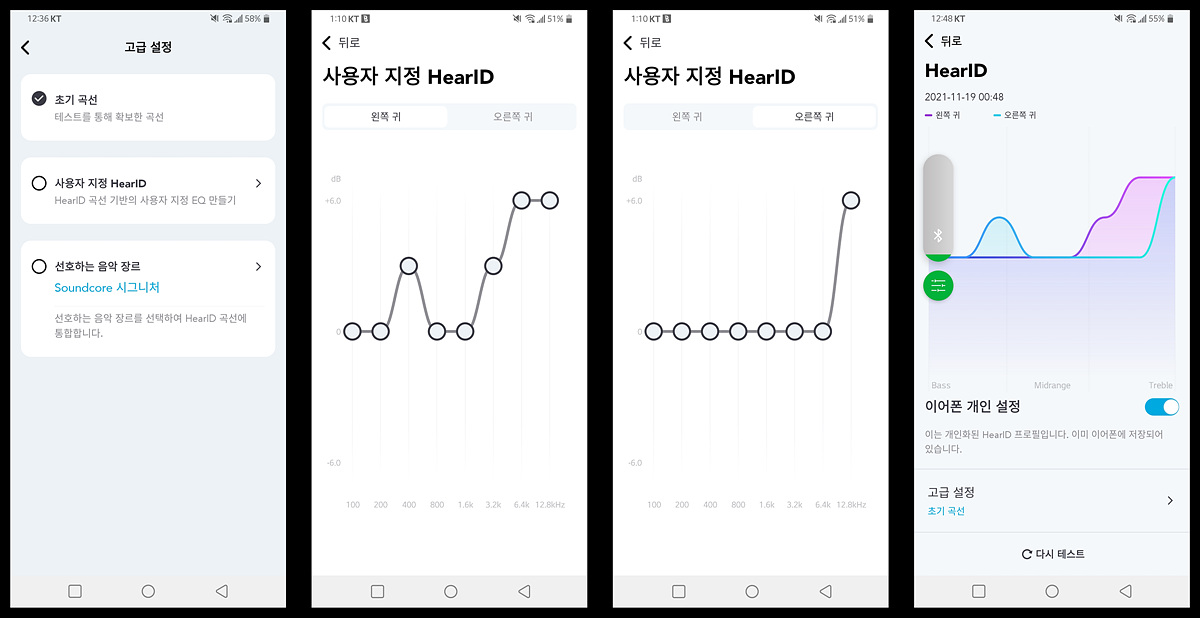 리버티3 프로에서 가장 눈에 띄는 부분인 HEAR ID 기능입니다. 사용자마다 다른 청력을 직접 측정해서 그에 맞는 소리나 노이즈 캔슬링의 정도를 조절해주는 기능입니다. 앤커에서 처음으로 적용된 기술은 아니지만 10만원대 제품에서는 처음 보는 거 같습니다. HEAR ID 사운드는 조용한 환경에서 측정을 해야 하며 측정하기 전에는 착용 테스트를 먼저 하시길 바랍니다.