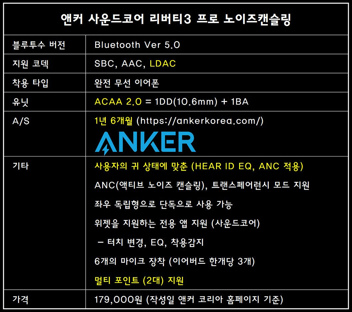 사운드코어 리버티3 프로의 스펙을 간단히 정리해보았습니다. 스펙을 보시면 아시겠지만 요즘 블루투스 이어폰에 들어가 있는 기능들은 모두 다 모아서 넣었습니다. 액티브 노이즈 캔슬링이야 10만원 미만대의 제품들에서도 많이 사용되고 있지만 리버티3는 여기에 사용자의 HEAR ID를 체크해서 EQ와 노이즈 캔슬링의 강도를 자동으로 세팅을 해주는 기능이 추가가 되었습니다. 예전에는 30만원 이상 제품에서 보던 기능인데 상당히 놀랍더군요.