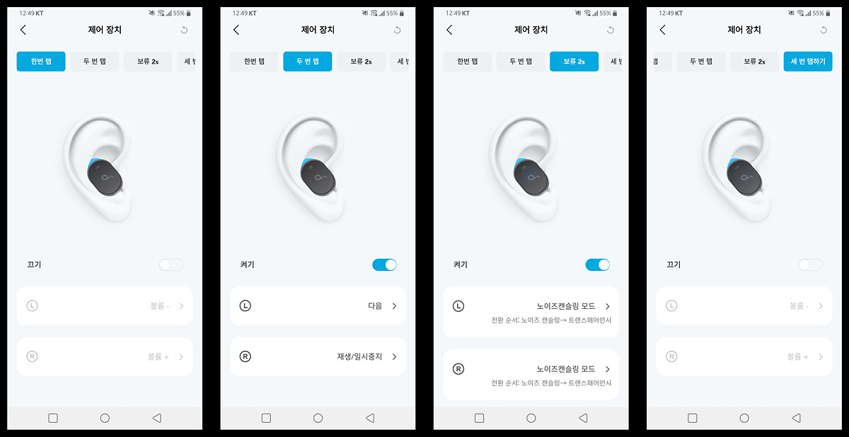 리버티3 프로는 물리 버튼이 아닌 터치 패널로 기능을 조절할 수 있으며 이 기능은 사용자의 임의로 설정이 가능합니다. 터치 오동작을 막기 위해 한번 터치는 모두 끄고 두 번 / 세 번 / 2초 터치로 설정을 했습니다. 기기의 설정에 사용자가 맞추는 게 아닌 사용자에 취향에 따라 기기를 맞추는 게 가능합니다.