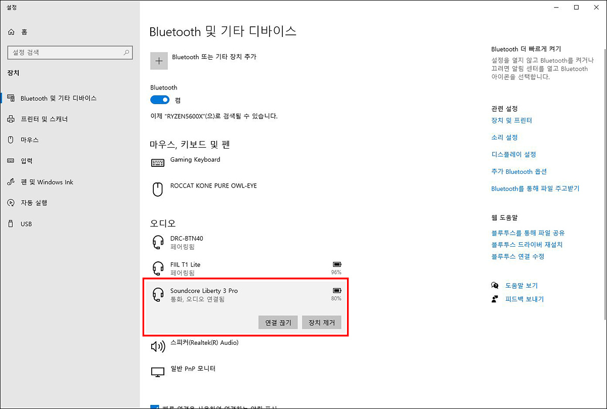 페어링 모드에서는 안쪽 LED가 깜빡거리게 됩니다. 멀티 포인트의 추가나 수동으로 페어링을 할 때는 커버를 위로 올린 상태에서 충전단자 옆에 있는 버튼을 약 3-4초간 누르면 페어링 모드로 들어갑니다. 페어링 목록을 모두 삭제한 뒤 버튼을 10초간 누르면 기기는 초기화됩니다.