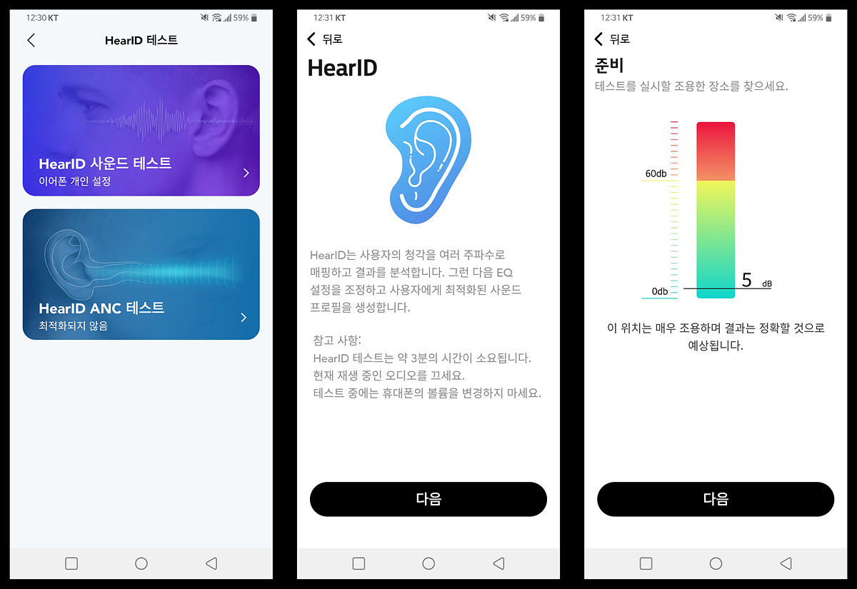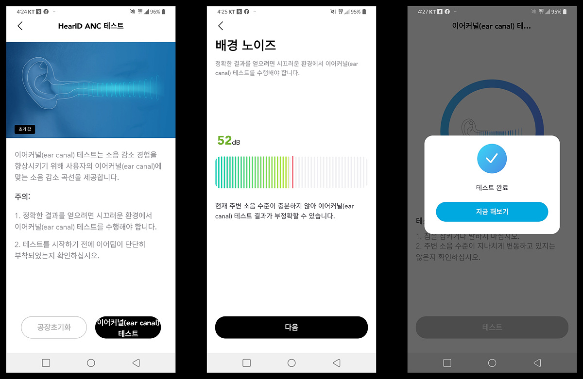 이제는 블루투스 음향기기에서 필수가 되어버린 노이즈 캔슬링도 HEAR ID로 측정을 해서 사용 환경에 맞게 사용할 수 있습니다. EQ와는 반대로 시끄러운 장소에서 테스트를 해야 합니다. (저는 지하철에서 테스트를 했습니다.)
