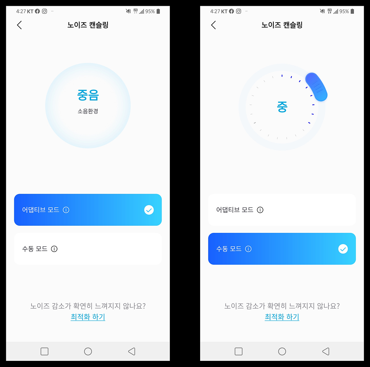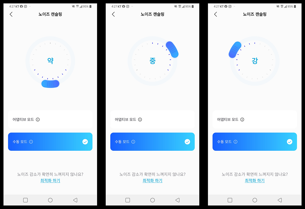 수동모드는 여러 가지로 단계를 조절할 수도 있지만 약 vs 강 차이가 크게 느껴지지는 않았습니다. 노캔의 성능이 나쁘다는 게 아니라 각 단계별 차이가 작다는 뜻입니다. ^^