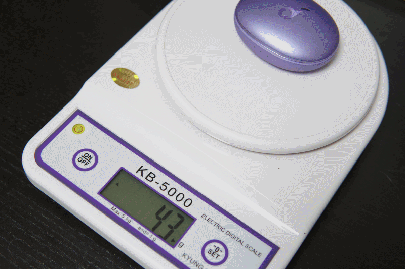 이어 윙과 팁을 장착한 이어 버드의 무게는 개당 7.5g이며 케이스는 43g으로 측정이 되었습니다. 아래에서 다루겠지만 이어 버드의 크기가 조금 큰 편이라 무게는 조금 나가는 편입니다.