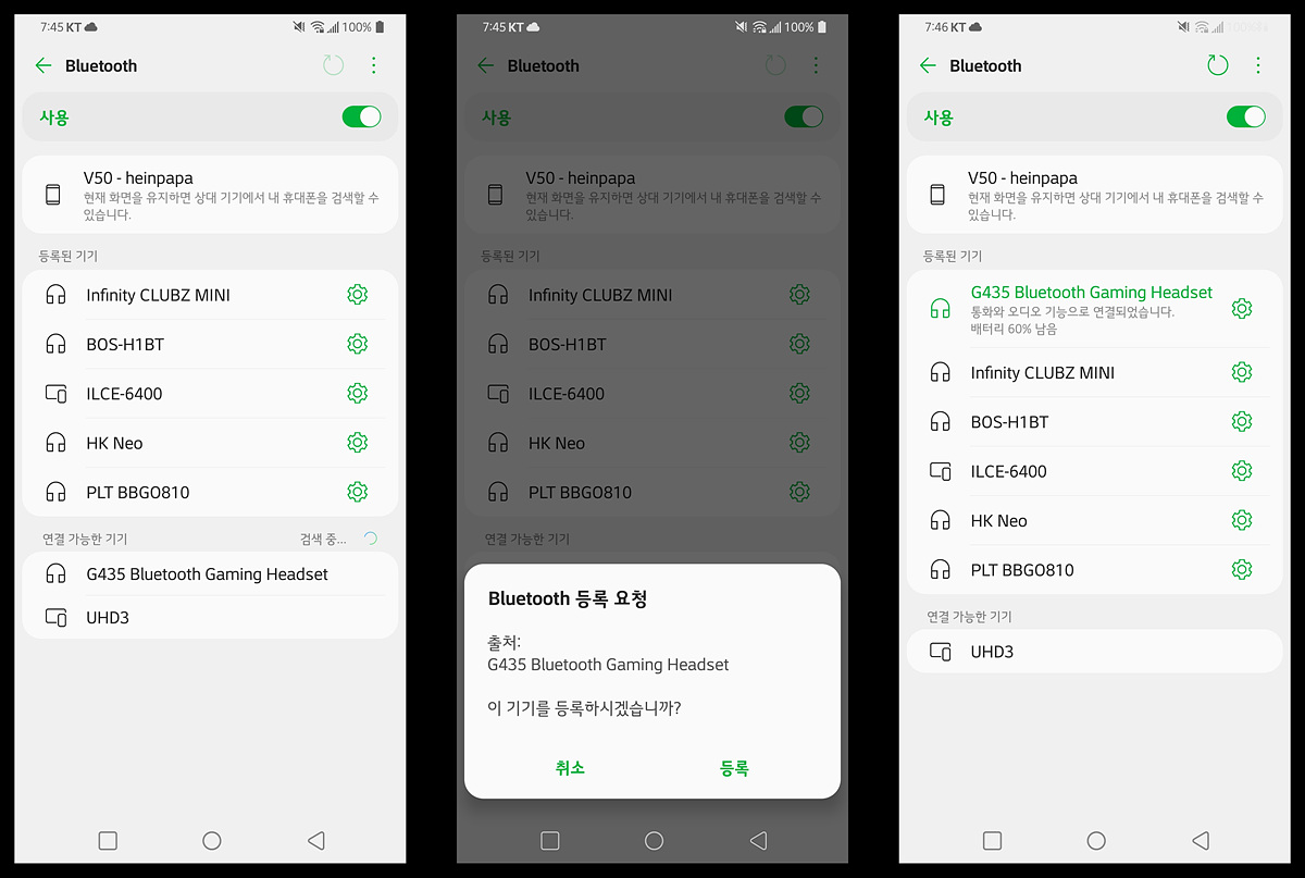 다른 블루투스 기기와 마찬가지로 기기 등록을 할 수 있습니다. 이후에는 음소거 버튼으로 무선과 블루투스 모드를 바꿀 있습니다. 전원을 켜면 이전에 사용했던 모드 (무선 or 블루투스)로 바로 동작합니다.