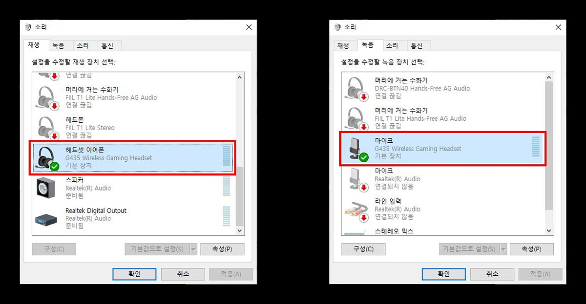 제어판에서 기본 장치로 (재생/마이크) 모두 확인이 되었습니다.