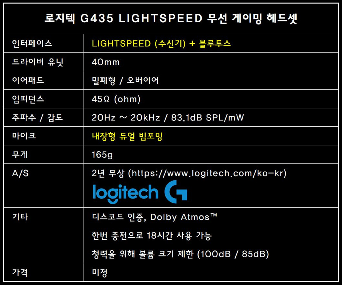 로지텍 G435 게이밍 헤드셋의 스펙을 간단히 정리해보았습니다. 스펙에서 가장 눈에 띄는 부분은 전용 수신기를 사용하는 무선(LIGHTSPEED)과 블루투스를 두 가지를 사용할 수 있는 무선 기능이었습니다. 로지텍뿐 아니라 다른 브랜드에서도 무선으로 사용할 수 있는 헤드셋은 많지만 두 가지 방식의 무선(수신기 + 블루투스)을 지원하는 제품은 그리 많지 않습니다. 마이크가 외부로 나오지 않는 내장 방식으로 되어 있어서 실내는 물론 실외에서도 블루투스 헤드폰처럼 사용할 수 있다는 장점을 가지고 있습니다.