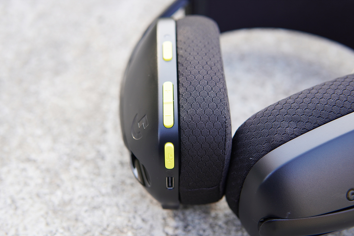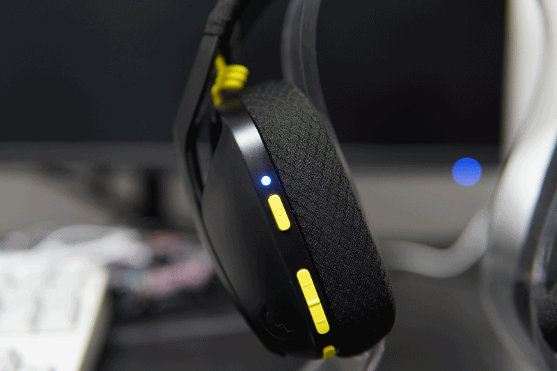 사용자를 기준으로 왼쪽 이어 컵에는 헤드셋의 기능을 조절할 수 있는 버튼과 충전 단자(Type-C)가 있습니다. 위쪽부터 전원 버튼 / 소리 조절(크게, 작게) / 마이크 음소거 버튼입니다. G435는 꽤나 많은 기능들이 있어서 마이크 음소거 버튼으로 여러 가지 기능을 조절하게 됩니다.