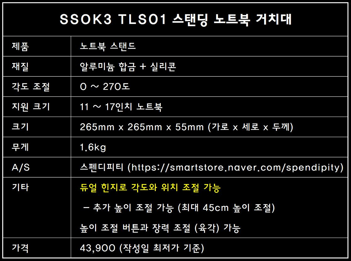 스마트폰의 보호 필름이나 케이스처럼 노트북을 사용할 때도 꼭 한 번쯤은 사용하게 되는 액세서리가 바로 스탠드(거치대)입니다. 노트북은 화면의 위치나 크기가 일반적인 모니터보다 작기 때문에 자연스레 자세가 삐뚤어져서 쉽게 피곤해질 수 있으며 이렇게 불편한 자세를 오랫동안 유지하게 되면 거북목처럼 건강에도 문제가 생기게 됩니다. 이런 불편함을 해결하기 위해서 많은 종류의 노트북 스탠드(거치대)가 있지만 이번에 소개하는 SSOK3 TLS01는 단순히 노트북의 각도만을 조절하는 게 아닌 듀얼 힌지로 각도 + 위치까지 조절할 수 있습니다. 추가로 리프트 버튼으로 스탠드의 높이까지 조절할 수 있는 특별한 기능을 가지고 있습니다.