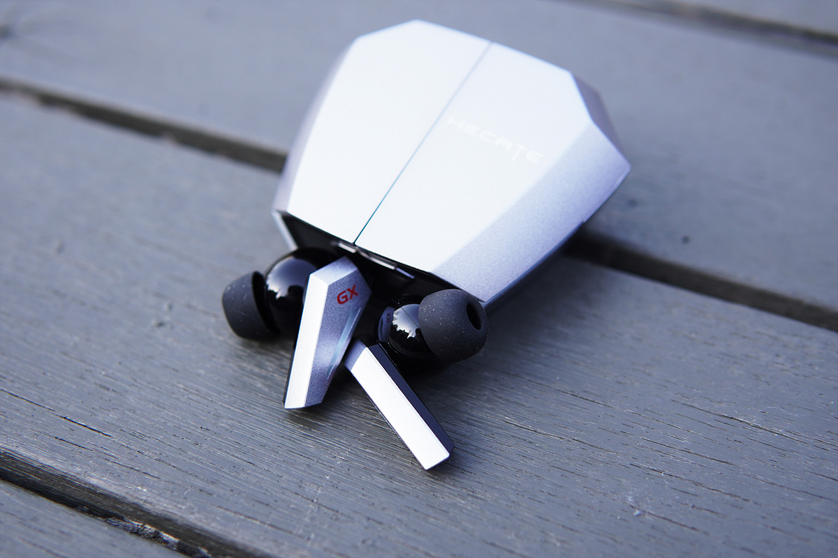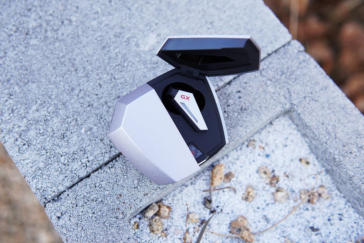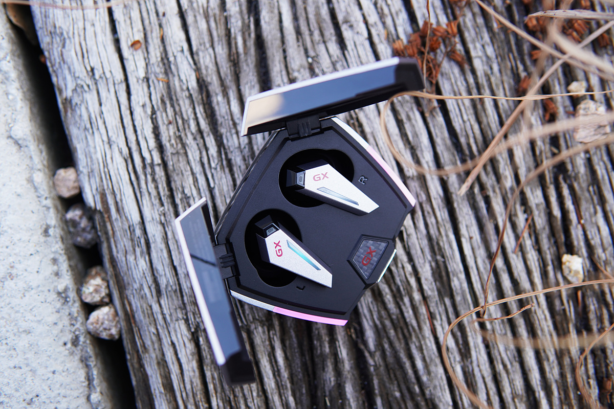 기존에 TWS 케이스들은 대부분 동그랗거나 둥근 사각형 모양으로 되어있는데 GX07 케이스 커버는 스포츠카의 윙 도어처럼 열리면서 페라리 엔초(Enzo) 같은 스포츠카를 보는 느낌입니다. 케이스 커버를 열거나 충전 중에는 측면 라인에서 RGB LED가 켜지게 됩니다. LED RGB가 대세가 된지라 이런 부분에 있어서는 좋은 효과를 보여줄 수 있지만 충전 케이스의 배터리 잔량을 확인할 수 있는 LED가 없다는 건 상당히 아쉬웠습니다. 보통은 케이스 앞쪽에 LED 한 개라도 넣어주는데 GX07은 배터리 잔량을 확인할 수 있는 어떤 표시도 없었습니다.