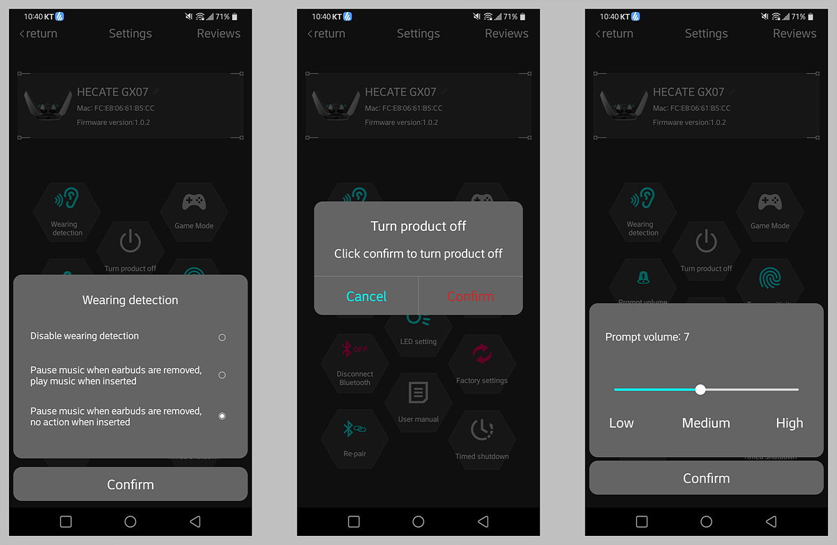 GX07은 위치 센서가 있어서 이어 버드를 귀에서 뺄 경우 자동으로 음악이 멈추게 됩니다. Wearing Detection에서는 이 동작을 바꿀 수 있으며 전원을 끄거나 음성 안내 멘트의 크기를 조절할 수 있습니다.