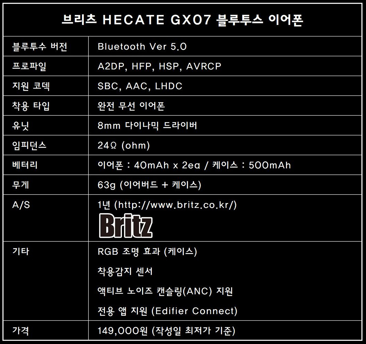 브리츠 헤카테 GX07 블루투스 이어폰의 스펙을 간단히 정리해보았습니다. 이 제품의 가장 큰 특징은 위에서 언급한 것처럼 ANC가 지원과 더불어서 전용(app) 앱을 지원한다는 점입니다. 매달 엄청난 수의 신제품을 출시하는 브리츠지만 전용 앱이 없다는 건 항상 아쉽게 생각했었는데 이젠 브리츠에서도 이런 부분으로 신경을 좀 쓰는 거 같아서 반가웠습니다. 착용 센서와 RGB LED 효과를 연출하고 있어서 다른 제품과의 차별성 역시 확실하게 보여주고 있습니다. 이런 부가 기능들 때문인지 제품의 출시 가격 역시 기존의 제품들보다는 조금 높게 책정이 되었더군요. 실제 제품의 외형이나 기능에 대해 좀 더 자세하게 살펴보도록 하겠습니다.