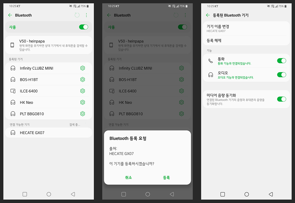 GX07은 케이스를 열게 되면 자동으로 페어링 모드로 진입이 됩니다. 다른 기기에서 페어링을 하거나 새롭게 연결을 하려면 케이스 안쪽의 GX 버튼을 사용하시기 바랍니다.