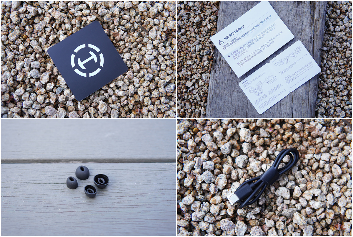 충전 겸 보관용 케이스, 설명서, 충전 케이블과 두 쌍의 추가 이어 팁으로 이루어져 있습니다.
