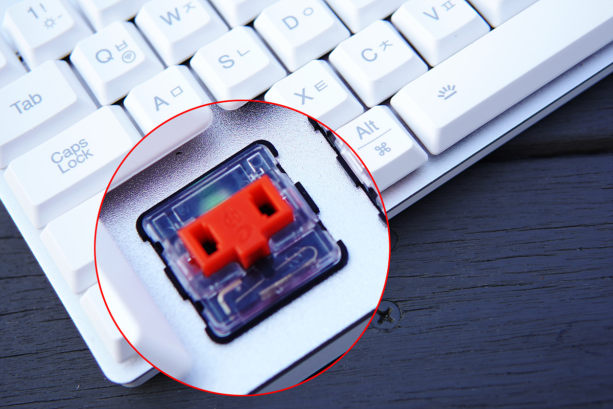 스위치의 구조상 스테빌라이저 역시 다른 스위치와 다른 모양으로 되어있습니다. 제품의 DB에도 키캡의 재질이 나와있지 않아서 ABS라고 생각을 했었는데 이게 좀 독특하더군요. PBT에서 느껴지는 까끌한 느낌과 ABS의 부드러움을 모두 느낄 수 있었습니다. 개인적인 생각이지만 따로 표기를 하지 않은걸 보면 ABS라고 생각됩니다.