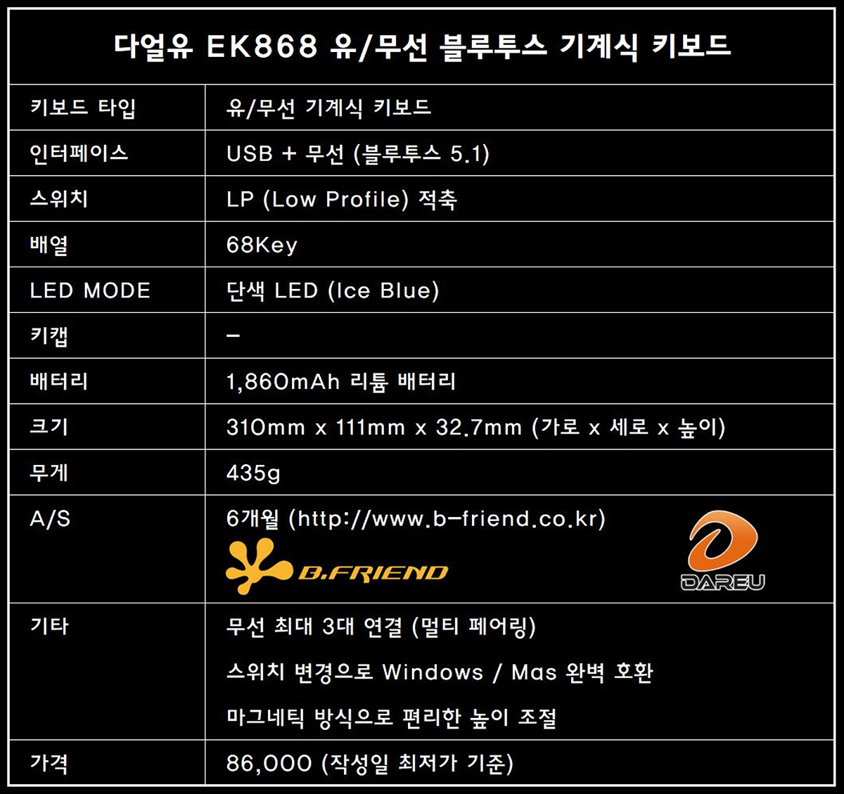 키캡 놀이가 제한적이라는 부분이 아쉬웠는데 이 부분은 스위치 구조의 특성이라 이걸 단점으로 놓아야 할지 고민이 좀 되더군요. 아마도 다른 단점이 많았다면 키캡을 단점으로 지적하지는 않았을 거 같습니다. 추가적으로 아쉬웠던 부분은 as 기간이었습니다. 보통 키보드의 경우 고객지원을 받을 수 있는 기간이 1년인데 EK868은 배터리 때문인지 1년이 아닌 6개월만 가능하더군요. 다른 블루투스 키보드보다 가격이 좀 높다는 점을 생각한다면 아쉬웠습니다.