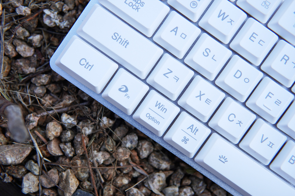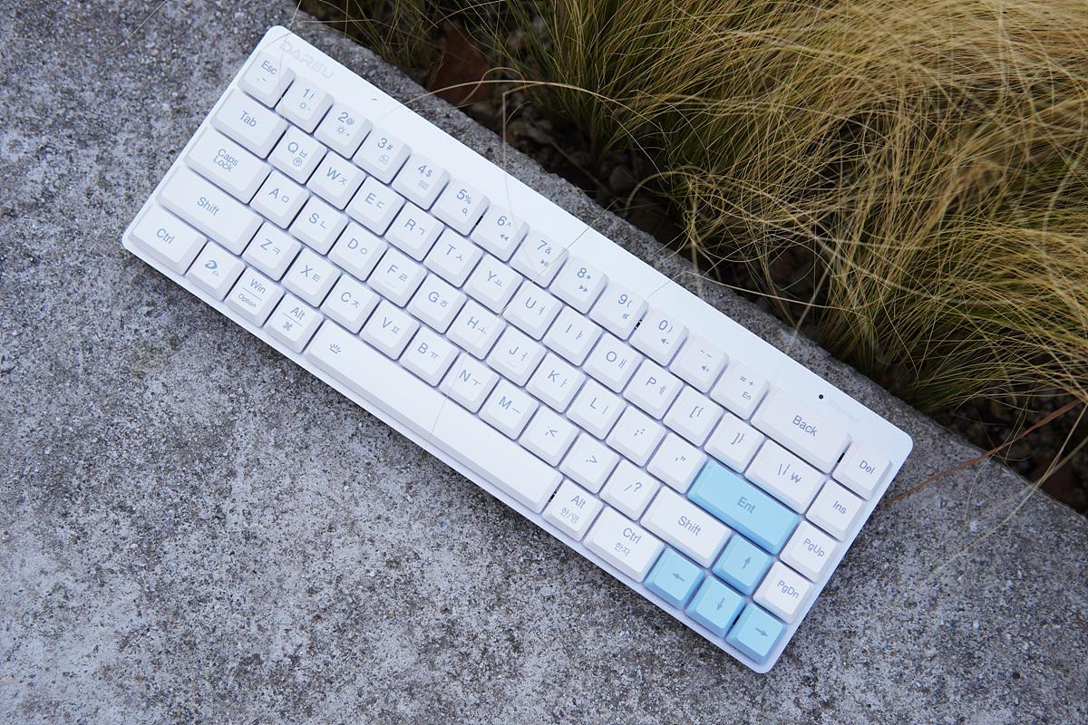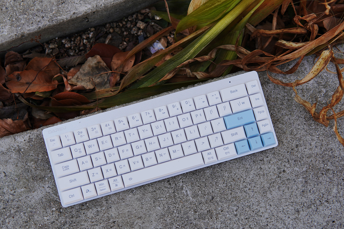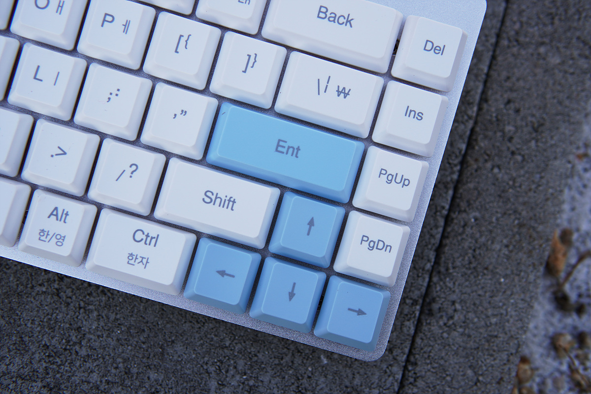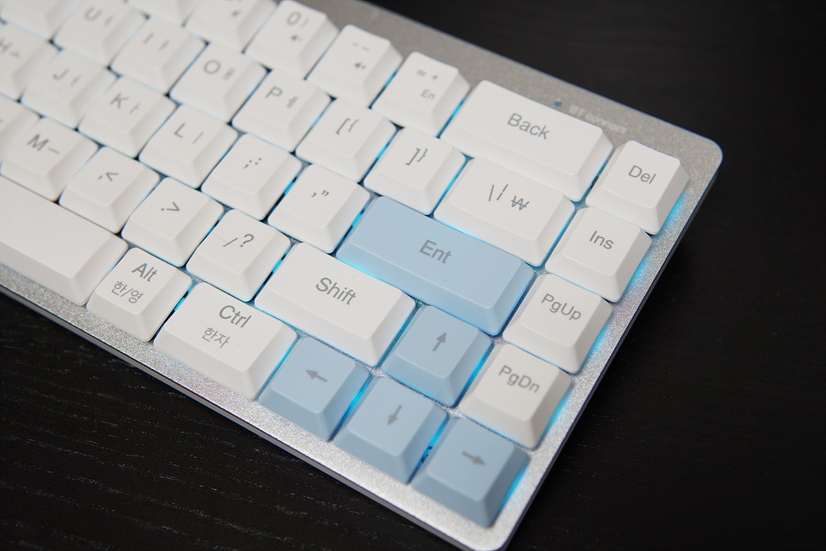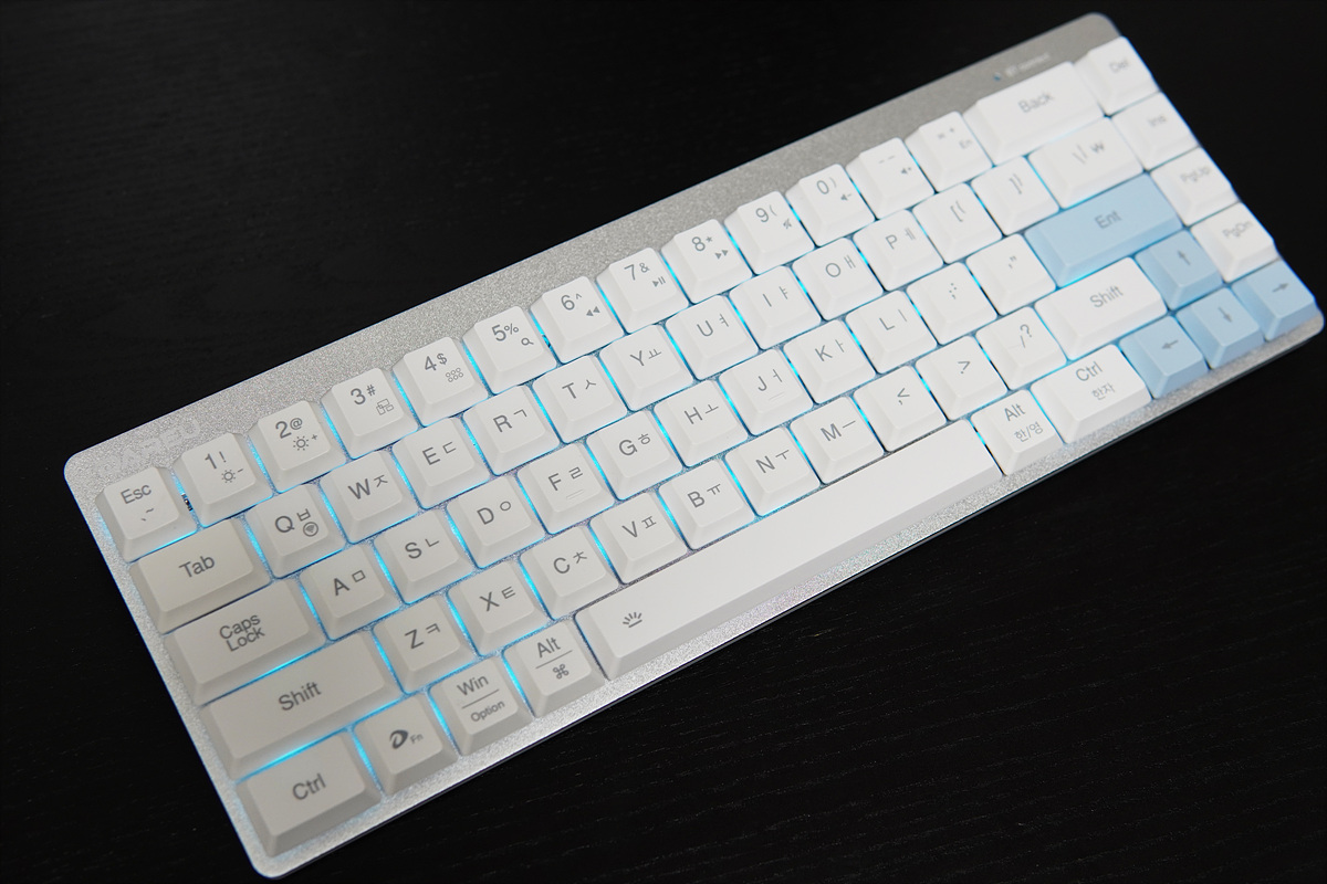 EK868 키보드의 첫인상은 상당히 좋았습니다. 알루미늄 상판에 화이트 키캡이 깔끔한 인상을 주었으며 엔터키와 방향키는 파란색으로 포인트를 주고 있습니다.