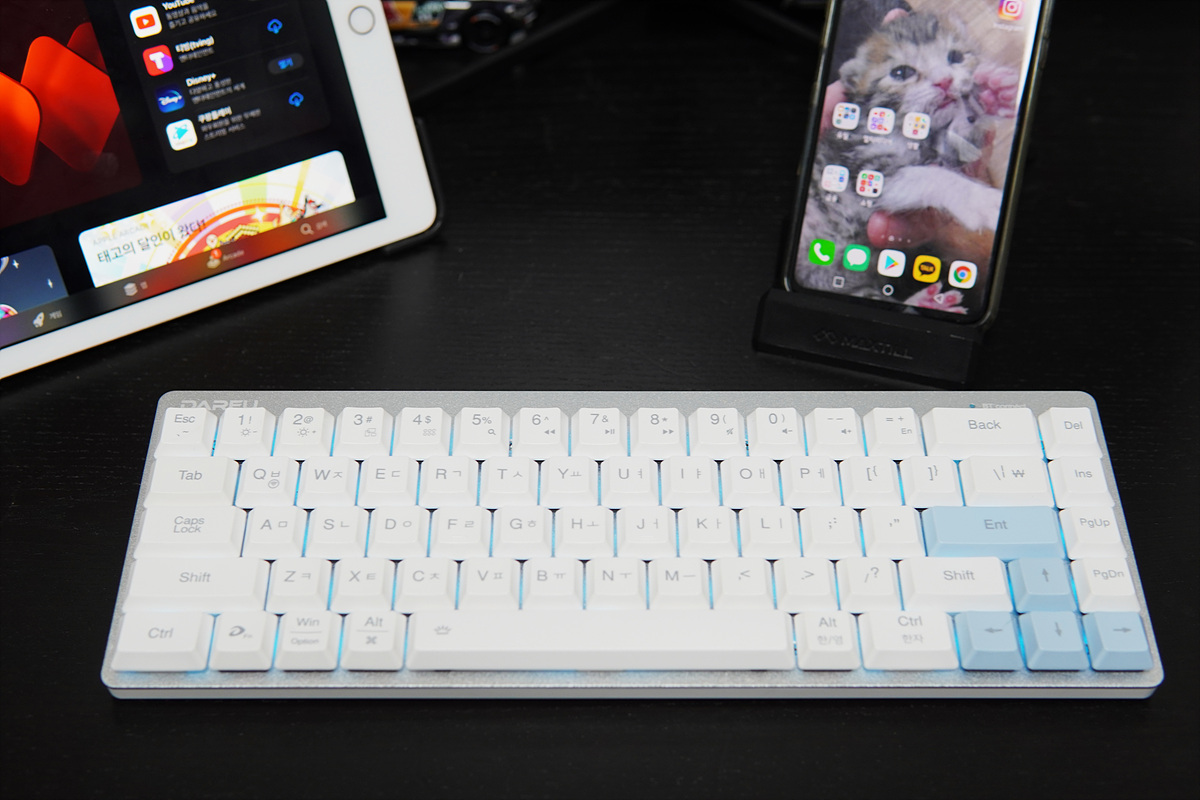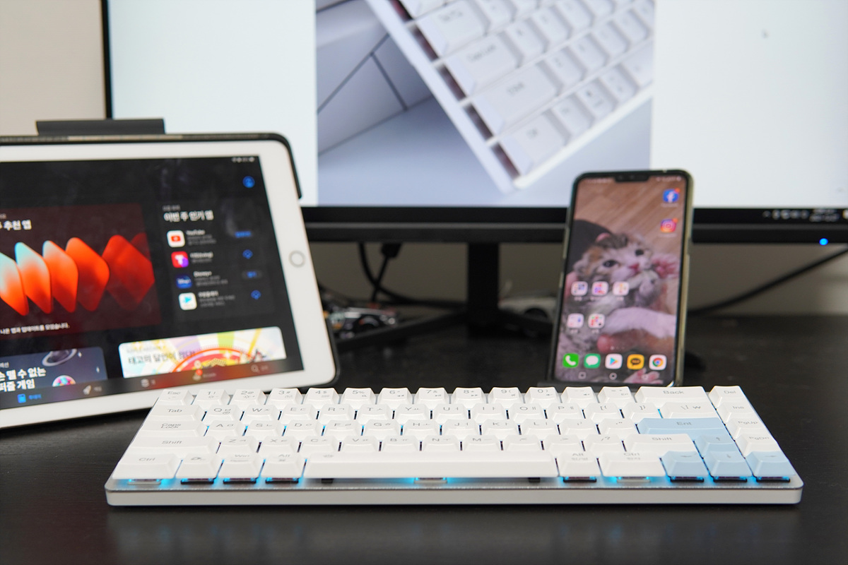 무선(블루투스)으로 3대까지 연결할 수 있는 부분은 다른 기기와 비슷하지만 유선으로 사용할 수 있는 부분과 물리 스위치를 통해서 기기간 연결(페어링)을 바꿀 있는 부분 역시 좋았습니다. 배터리는 LED를 켠 상태에서도 며칠 동안 충분히 사용할 수 있는 용량이었으며 Type-C 포트로 어디서나 편리하게 충전을 할 수 있습니다. 키보드에서 가장 중요한 부분인 키감 역시 낮은 높이로 인해 다른 스위치와는 확실한 차이를 느낄 수 있었습니다. 스테빌라이저나 통울림 역시 일반 키보드들에 비해 전혀 떨어지지 않는 수준이었습니다.