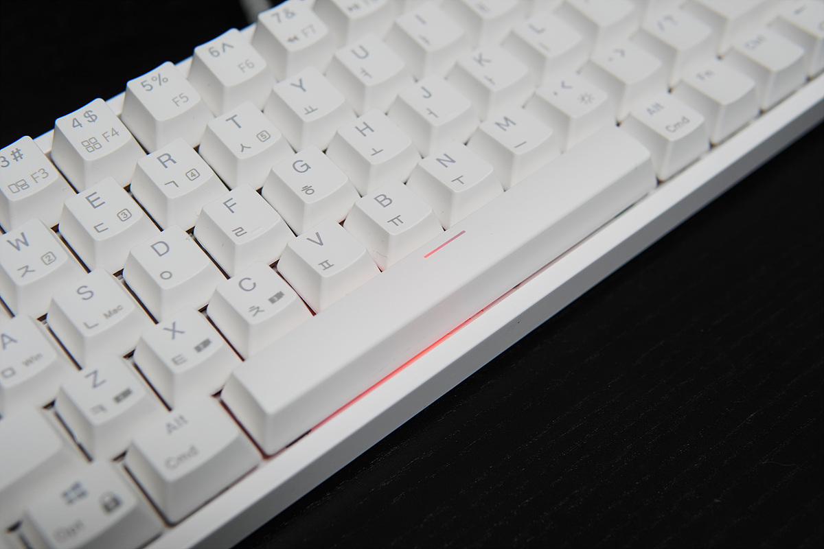 스위치를 끈 상태에서 충전기나 보조 배터리를 연결해서 충전을 할 때는 스페이스바에 빨간색 LED가 켜지며 충전이 완료되면 LED는 꺼집니다.