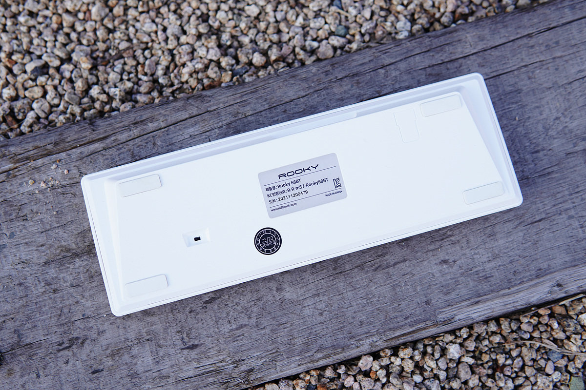 바닥면에는 On / Off 스위치가 있습니다. Rooky 68BT는 유선과 무선을 모두 지원하고 있습니다. 블루투스 방식으로 사용할 때는 전원을 On으로 해야 하고 유선 모드로 사용할 때는 케이블을 연결한 상태에서 스위치를 Off로 해야 합니다. 개인적으로는 이 스위치가 바닥이 아닌 위쪽이나 측면으로 두는 게 더 좋았을 거라 생각합니다. 유선 / 무선 모드를 자주 바꾸지는 그래도 변경을 할 때마다 키보드를 들어야 하는 게 조금 불편했습니다.