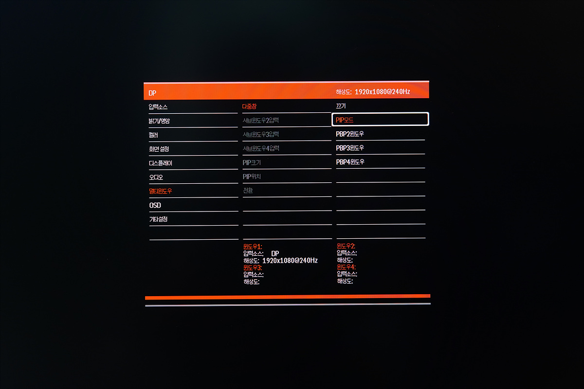 MB27F240의 큰 특징 중 하나인 PIP / PBP 기능입니다. 메인은 입력 소스 1번으로 동작하게 되고 나머지 2, 3, 4번 값의 변경을 통해서 사용과 위치를 바꿀 수 있습니다.