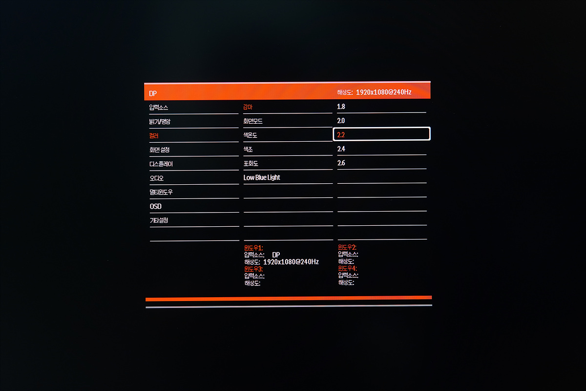 캘빈 값을 바꿀 수 있는 색온도는 기본이 사용자 모드로 되어있으며 이 설정일 때 노란빛이 조금 도는 편입니다. 차갑게는 파란색이 너무 강한 편이라 정상 / 따뜻하게 두 가지 모드로 사용하는 걸 추천합니다. 이 세팅은 제 개인적인 느낌이므로 절대적인 값은 아닙니다. 색온도를 설정하면서 자신에게 잘 맞는 값으로 사용하는 게 가장 좋습니다. 사용자 모드에서는 R / G / B 3개의 값을 각각 따로따로 조절할 수 있습니다.