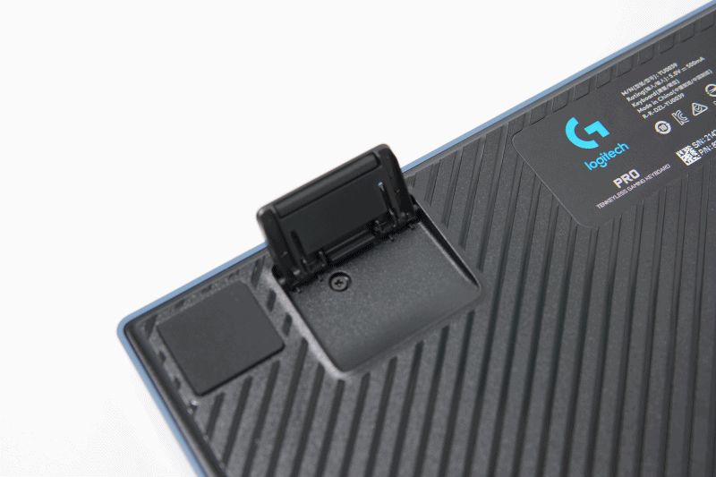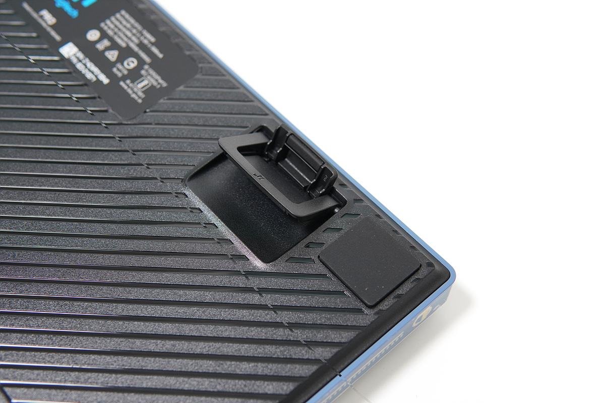 바닥에는 높이 조절용 다리가 두 개 있어서 사용자가 원하는 대로 조절할 수 있으며 미끄러짐을 방지할 수 있도록 5곳에 마감을 했습니다. (다른 키보드들보다 상당히 큰 편이네요)