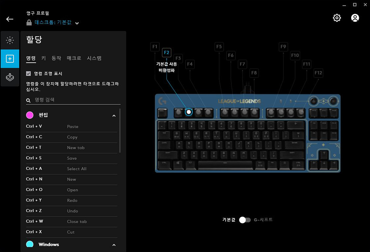 게임 모드를 실행하면 특정 키들을 사용할 수 없게 됩니다. 이 기능은 기본적으로 설정되어있는 키(Win key)가 있으며 화면처럼 내가 원하는 키를 추가할 수 있습니다. 보통 게이밍 키보드에서는 Win Key나 Alt + Tab와 같이 지정되어 있는 키만 사용할 수 있지만 G Pro는 내가 원하는 키들을 추가할 수 있습니다.