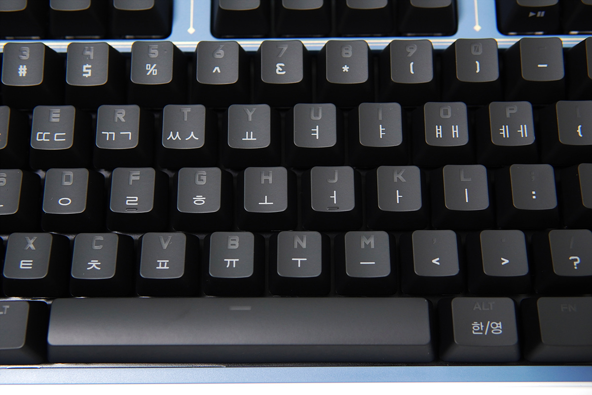 제품을 테스트하면서 가장 아쉬웠던 부분이 바로 이 키캡이었습니다. ABS 재질에 UV 코팅을 한 거라 생각되는데 그 덕분에 손의 지문이나 유분이 너무 잘 묻어납니다. 라이선스 비용이 있겠지만 그래도 키보드 가격을 생각한다면 아쉬울 수밖에 없는 부분입니다.