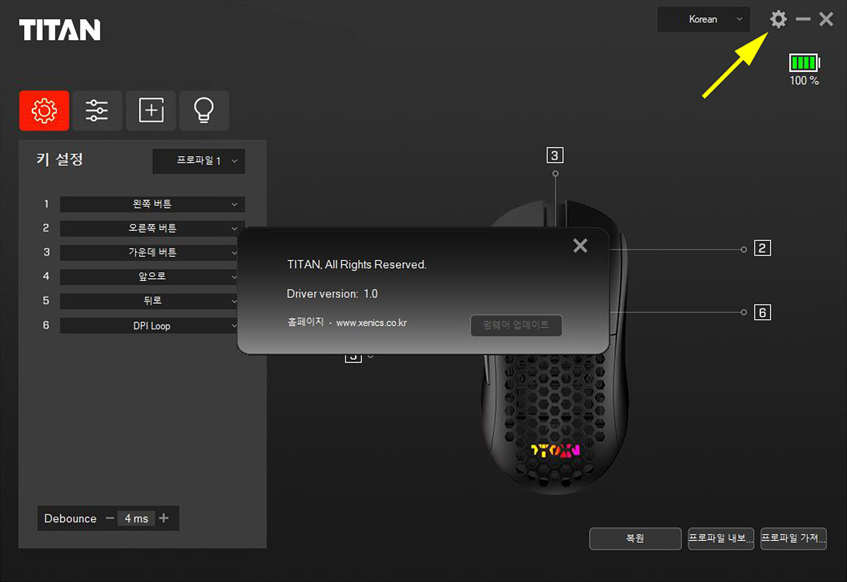 프로파일은 4개까지 지정할 수 있으며 설정된 부분은 파일로 만들어서 내보내기나 다시 불러올 수 있습니다. 왼쪽 아래의 Debounce 기능은 버튼 반응 시간을 조절하는 메뉴로 너무 짧게 할 경우 더블 클릭으로 인식할 수 있으니 이럴 경우는 시간을 조금 더 길게 수정을 해야 합니다.