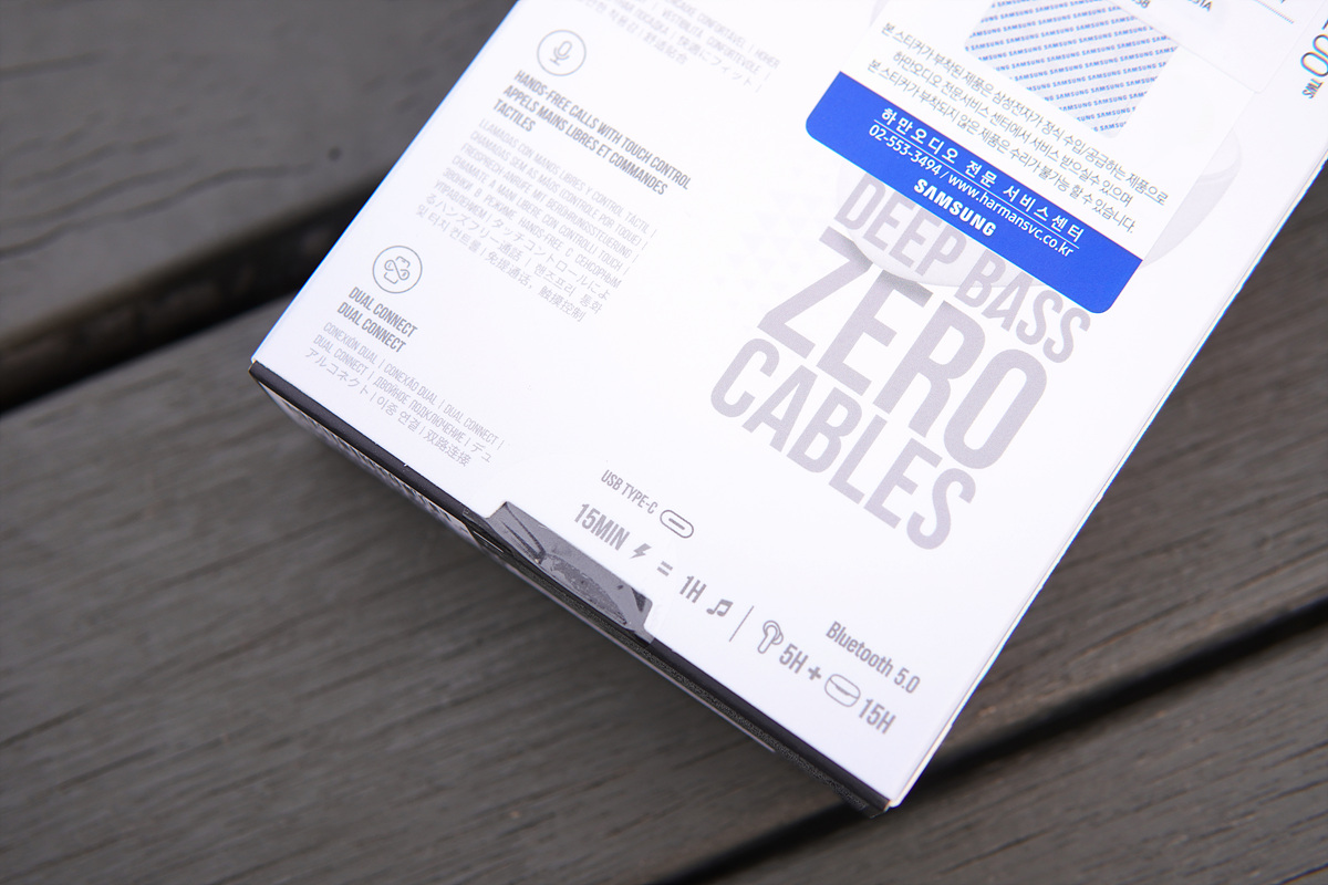 뒷면에는 제품의 특징들이 자세하게 설명되어 있으며 하만 오디오 정품 스티커와 봉인 스티커가 부착되어 있습니다. 하만의 경우 삼성에서 인수를 했지만 서비스는 삼성 고객센터가 아니라 하만오디오 전문 센터에서 따로 처리를 하고 있습니다. 고객지원을 받기 전에는 전화나 홈페이지를 통해 꼭 미리 확인하시기 바랍니다.