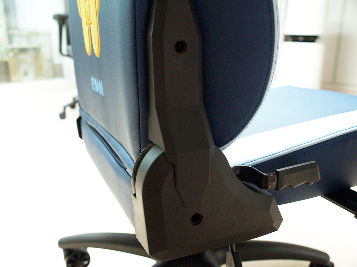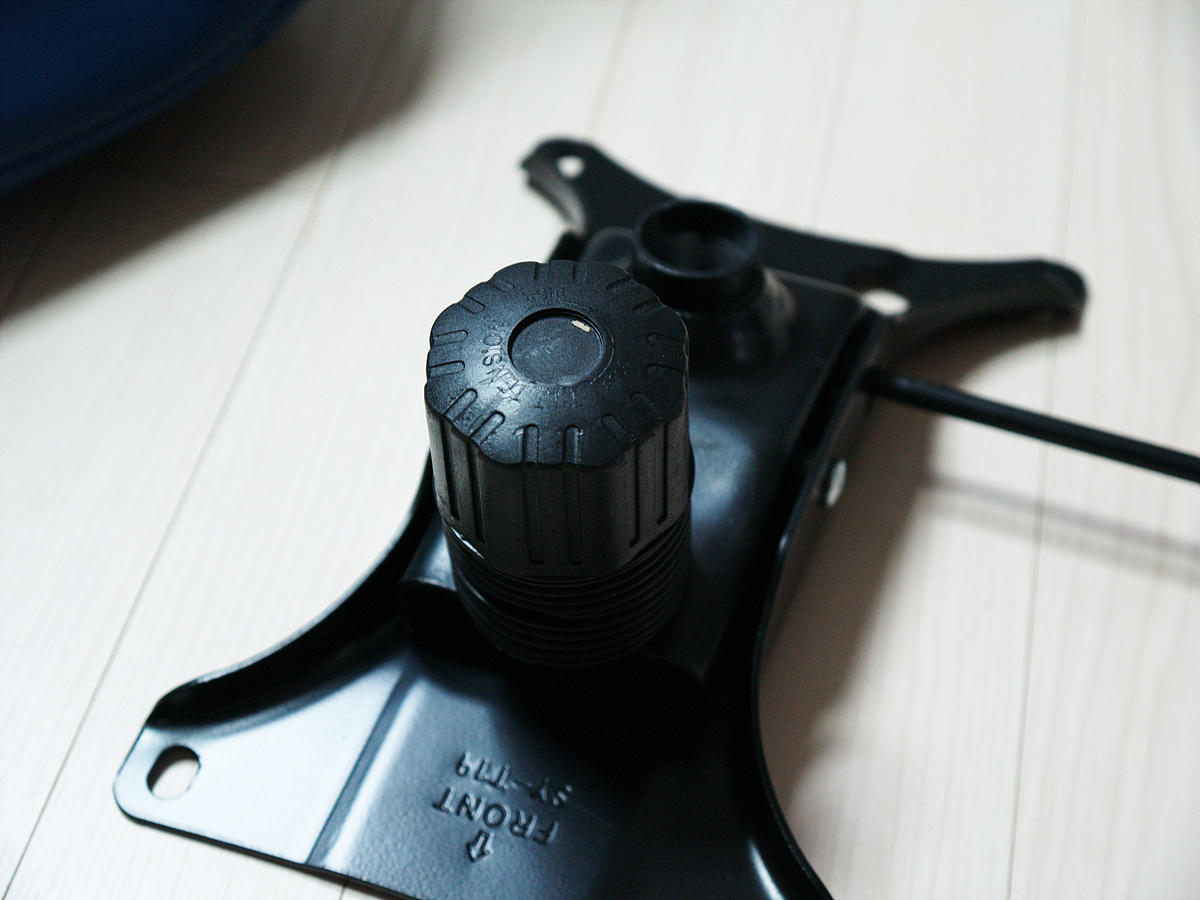 저 부분을 돌리면 의자의 틸팅 강도를 조절할 수 있습니다. 앉았을 때 기준으로 왼쪽으로 돌리면 강해지고 반대 방향인 오른쪽으로 돌리면 약해집니다.