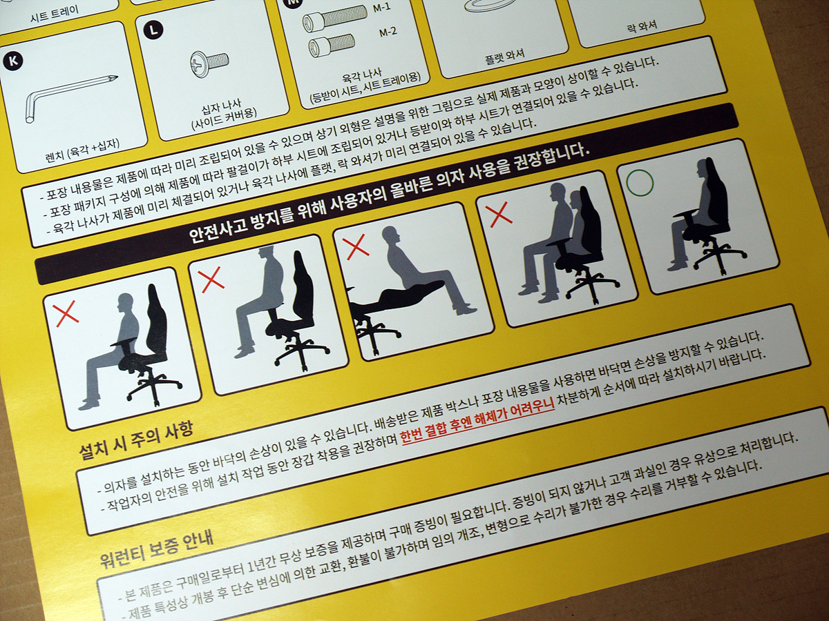 조립 설명서는 단계별로 쉽게 설명이 되어있습니다. 주의사항에도 있지만 설치하는 동안에는 박스를 이용해서 바닥을 보호하는 게 좋습니다. 그런데 진짜 저 그림처럼 저렇게 앉는 사람이 있을까요?