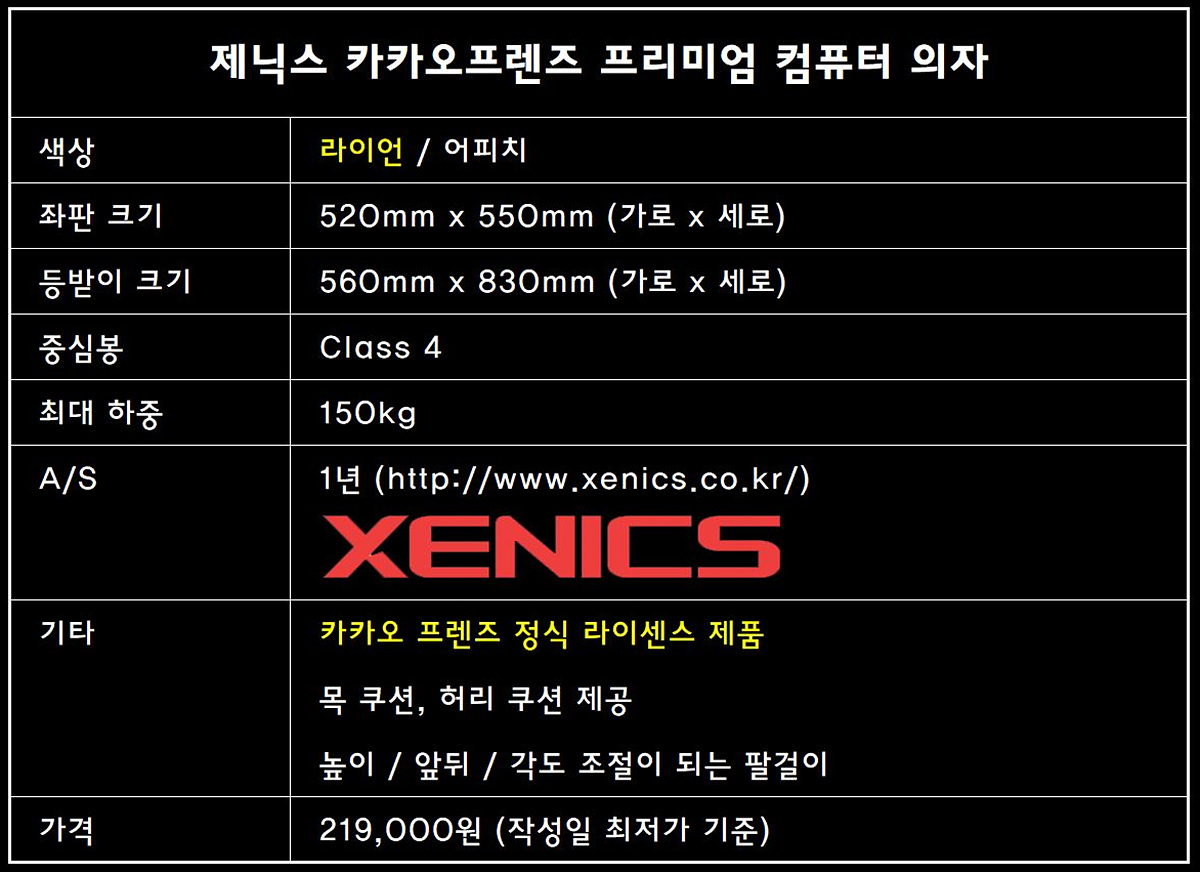 우리나라에서 만든 캐릭터중에서 가장 인기 있는 캐릭터 투표를 한다면 상위권에는 분명 카카오프렌즈의 캐릭터가 있을 거라 생각합니다. 그중에서도 라인언과 어피치는 가장 성공한 캐릭터라고 할 수 있죠. 캐릭터 인형뿐만 아니라 요즘은 IT 관련 기기뿐만 아니라 생활용품에도 카카오 캐릭터의 디자인이 들어간 제품들을 손쉽게 찾아볼 수 있습니다. 이번 시간에 소개하는 제품은 바로 이 카카오프렌즈와 콜라보레이션을 한 제품인 "제닉스 카카오프렌즈 컴퓨터 의자"입니다. 제닉스는 게이밍 체어로도 유명하지만 여러가지 브랜드와의 콜라보레이션으로 다양한 사용자들의 취향을 만족시키고 있습니다. 특히나 남자들이 좋아하는 유럽 축구 구단 제품들은 오랫동안 큰 인기를 끌고 있습니다.