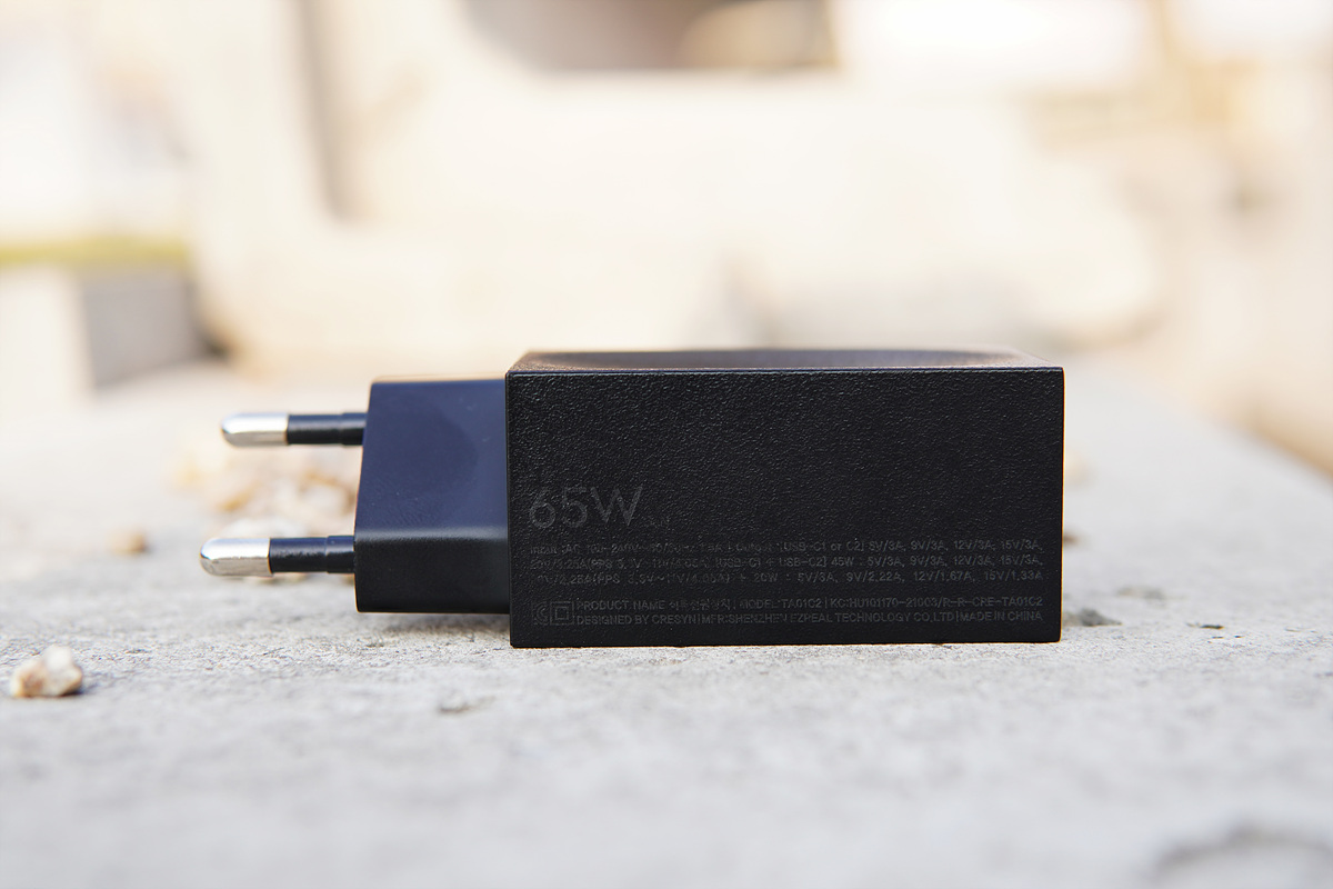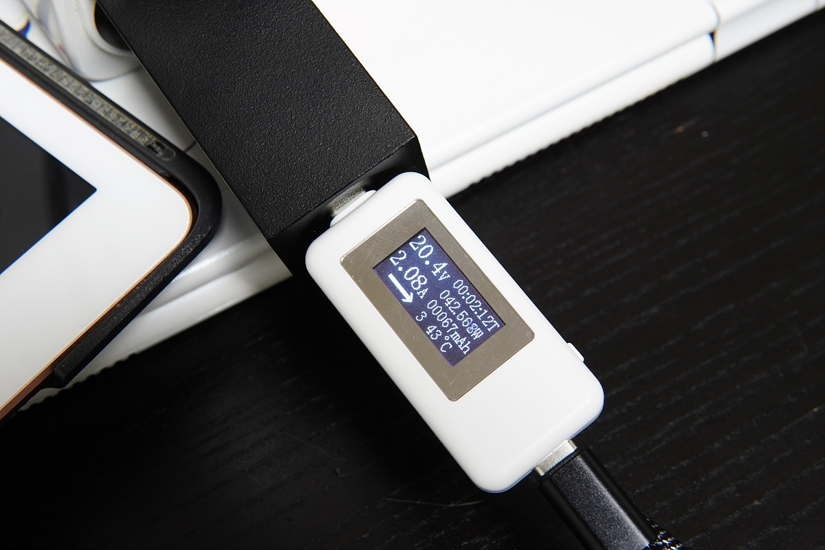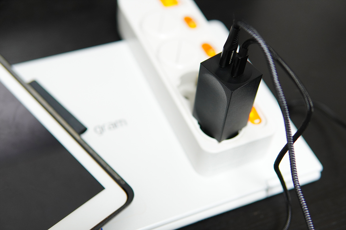 단일로 사용할 때 65W를 지원하고 두 개의 기기를 동시에 사용하더라도 45W+10W의 출력을 낼 수 있어서 노트북(gram)도 빠르게 충전할 수 있습니다. 고성능의 게이밍 노트북을 제외한다면 비슷한 사양의 노트북은 40~60W대의 출력을 필요로 하기 때문에 무거운 어댑터를 들고 다닐 필요가 없습니다. PD 포트로 노트북을 충전하기 위해서는 충전기뿐 아니라 케이블도 중요하기 때문에 출력이나 전류값을 꼭 확인하시기 바랍니다.