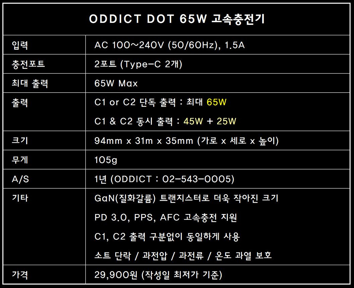 최대 65W 고출력, USB-C 2포트 동시 충전 가능 오딕트 닷 DOT.