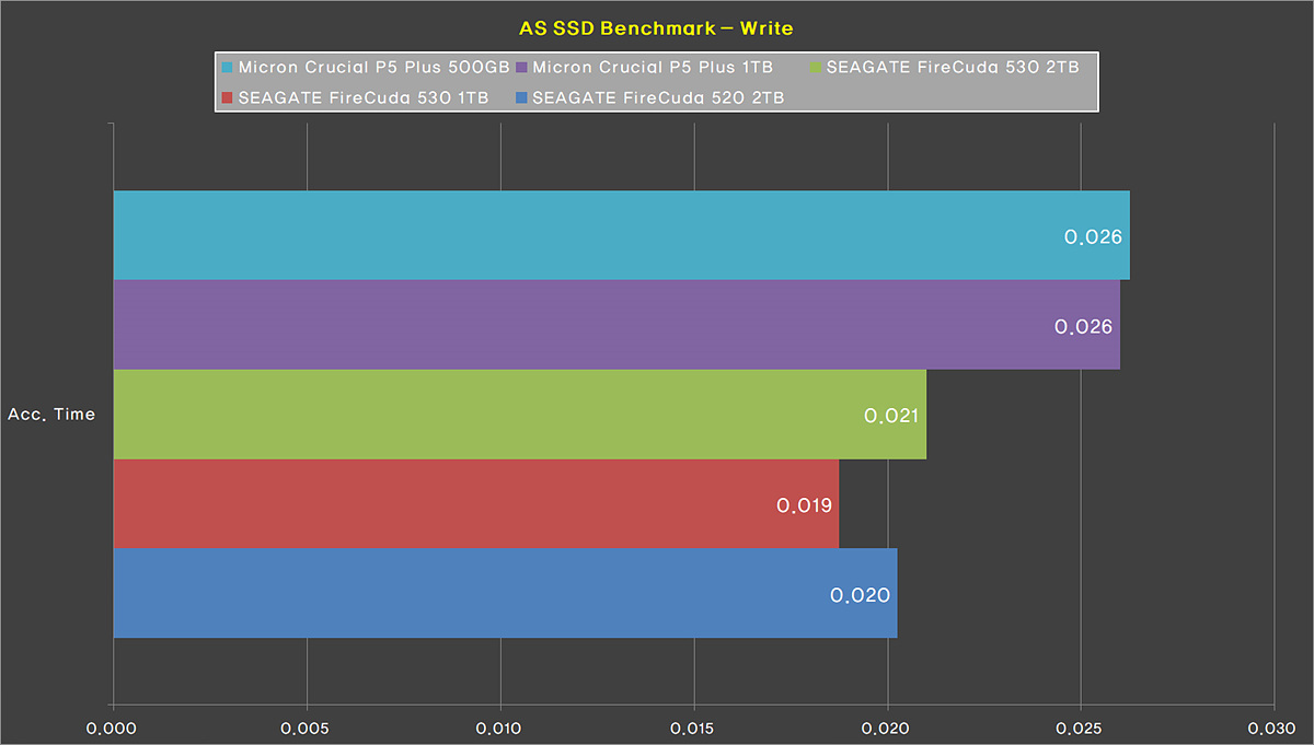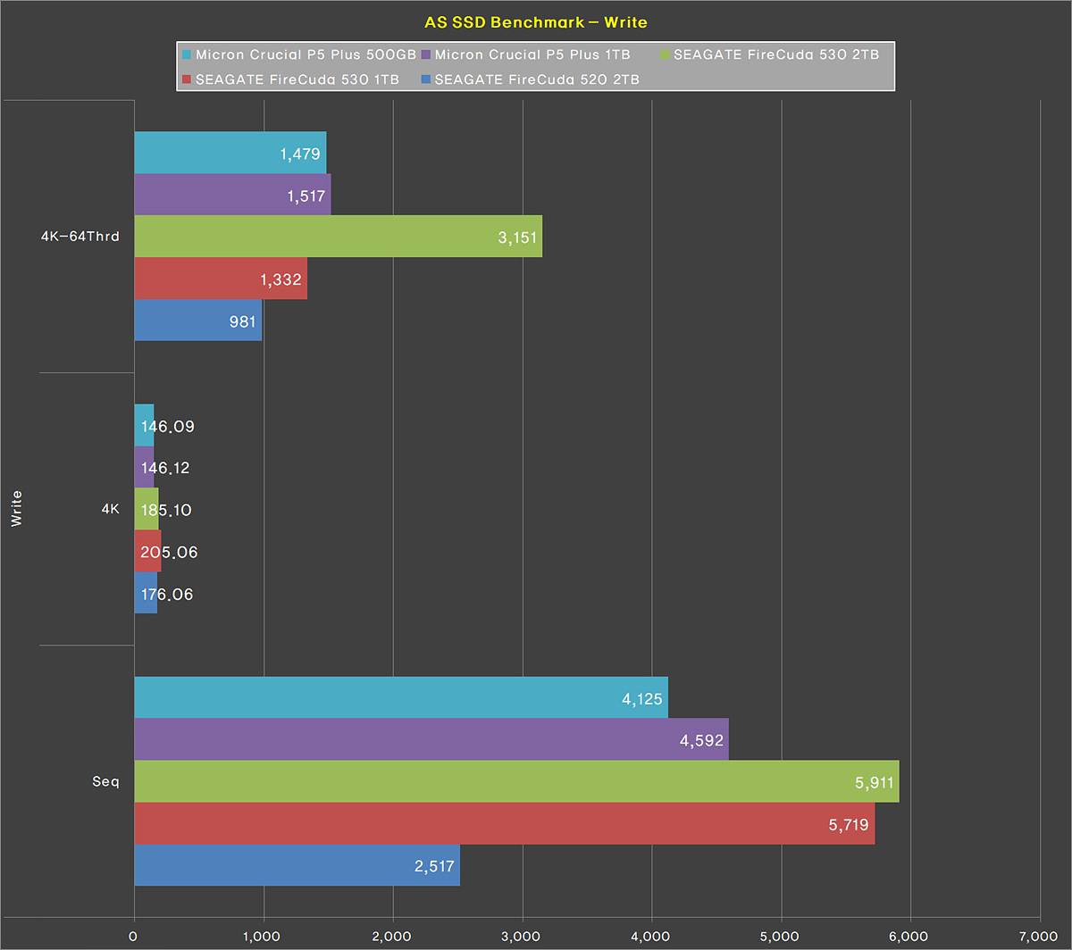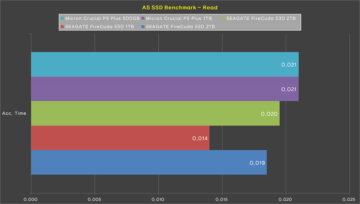 AS SSD를 4회 측정한 결괏값의 평균입니다. 마이크론 제품들이 Access Time이 조금 높은 편인데 P5 Plus에서도 비슷하게 이어졌네요. 추가로 4K를 64회 반복하는 읽기도 다른 제품들에 비해 살짝 떨어지는 모습이었습니다.