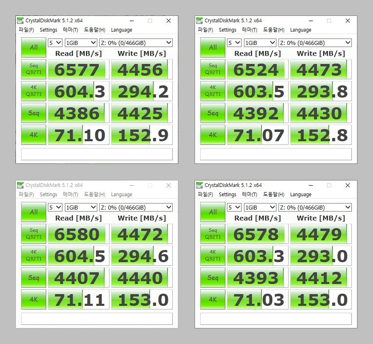 AJA 테스트를 제외한 모든 데이터는 정확도를 높이기 위해 4번씩 측정한 뒤 평균을 냈습니다. 모든 측정값은 사용하는 PC 환경에 따라 달라질 수 있으니 참고해주세요.