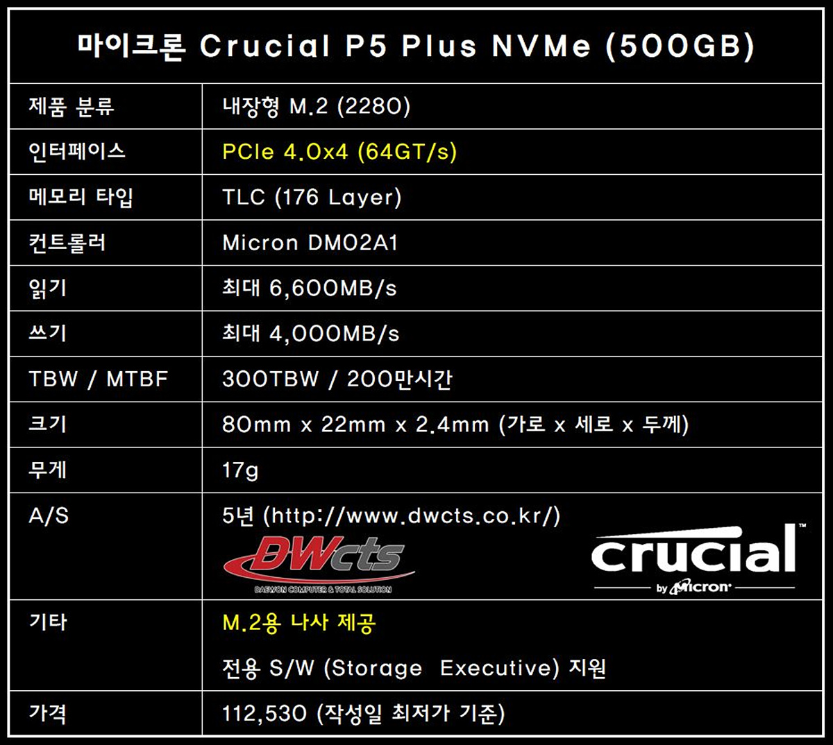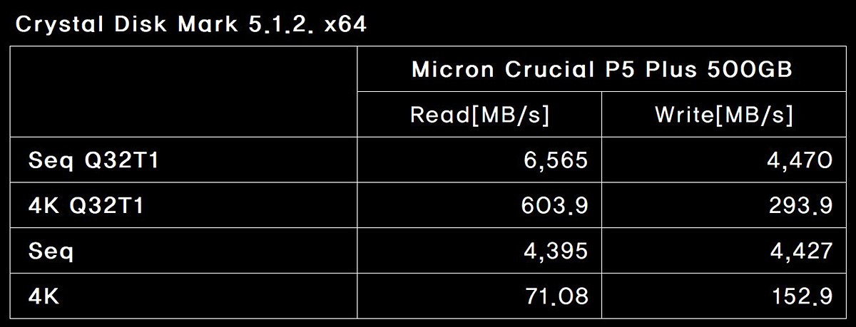 이번 시간에 소개하는 마이크론 크루셜(Crucial) P5 Plus는 이런 PCIe 4.0을 지원하는 NVMe SSD입니다. 176 Layer의 TLC 메모리가 사용되었으며 마이크론 자체 컨트롤러를 사용하고 있습니다. 디램도 포함되어 있지만 정확한 용량까지는 확인할 수가 없었습니다. 500GB 용량의 제품은 최대 6,600 / 4,000MB/s의 읽기, 쓰기를 지원하고 있으며 300 TBW의 보증하고 있습니다. SSD의 경우 용량이 클수록 속도와 보증(TBW)도 같이 높아지기 때문에 주머니 사정만 넉넉하다면 되도록 큰 용량의 제품을 선택하는 게 좋습니다. ^^ PCIe 4.0 SSD의 성능은 어떨지 벤치를 통해 확인해보겠습니다.