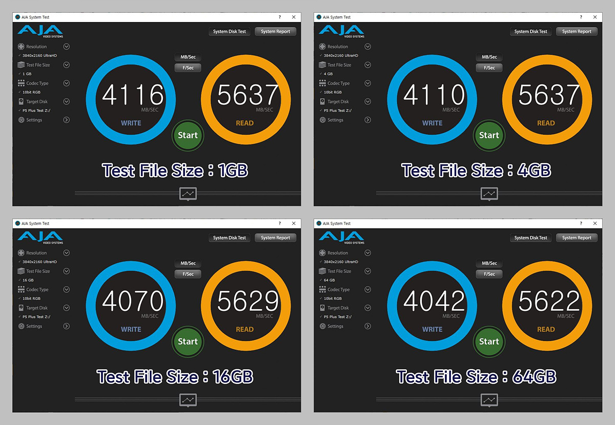 랜더링에 관련된 부분을 측정하는 AJA 벤치는 UHD / sRGB 100%를 기준으로 하였으며 1GB / 4GB /  16GB / 64GB 파일의 크기별로 각각 측정하였습니다.