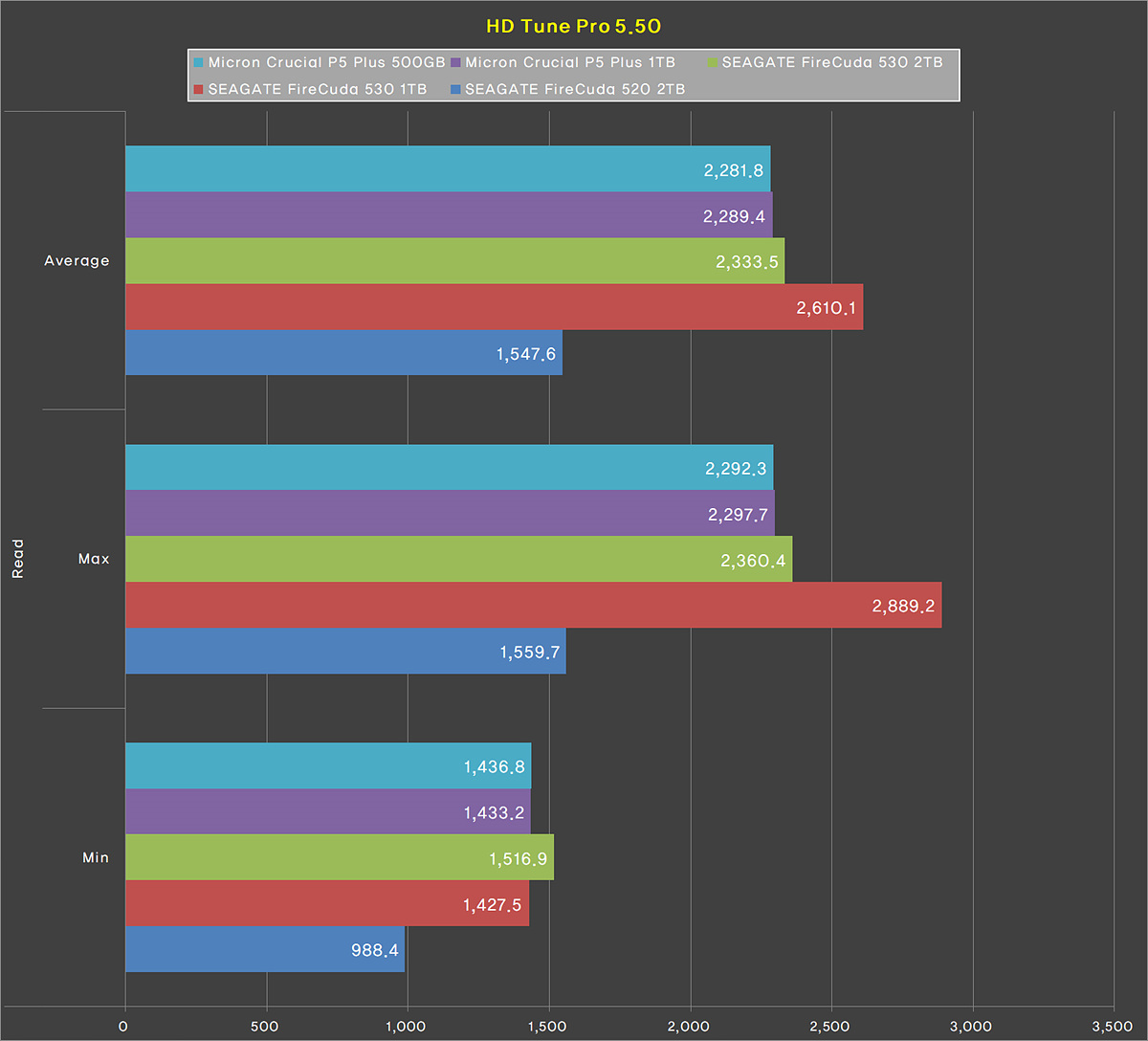 PCIe 4.0을 지원하는 제품들과의 비교 그래프입니다. 처음에 언급을 했지만 SSD는 용량이 클수록 속도 역시 조금씩 올라가게 됩니다. P5 Plus 500 SSD는 스펙보다 더 높은 성능을 보여주었습니다.