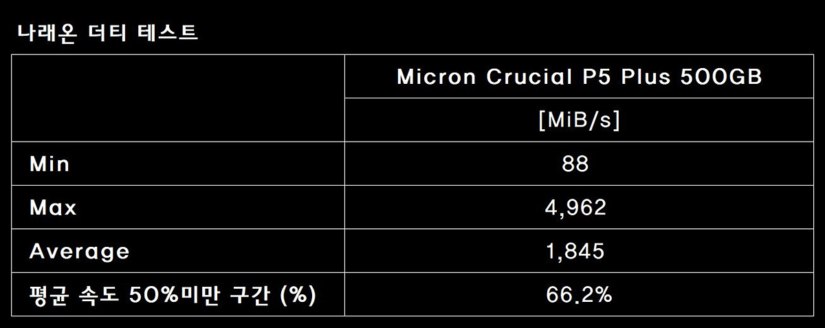 SSD의 쓰기 성능을 100%까지 모두 테스트하는 나래 테스트에서는 75%까지의 캐싱 구간은 상당히 빠른 모습이었으며 이후에는 속도가 떨어지게 됩니다.