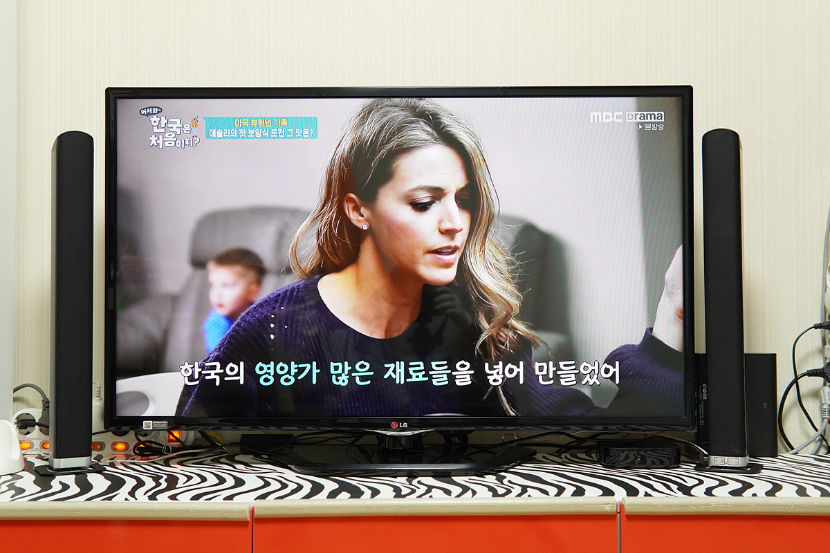 스피커를 분리해서 TV 양쪽으로 배치한 모습인데 42인치 TV와도 잘 어울리네요. 사운드바 형태나 좌우가 분리된 스피커의 형태 모두 60인치가 넘어가는 대형 TV보다는 40 ~ 50인치대의 크기와 잘 맞을거 같습니다.