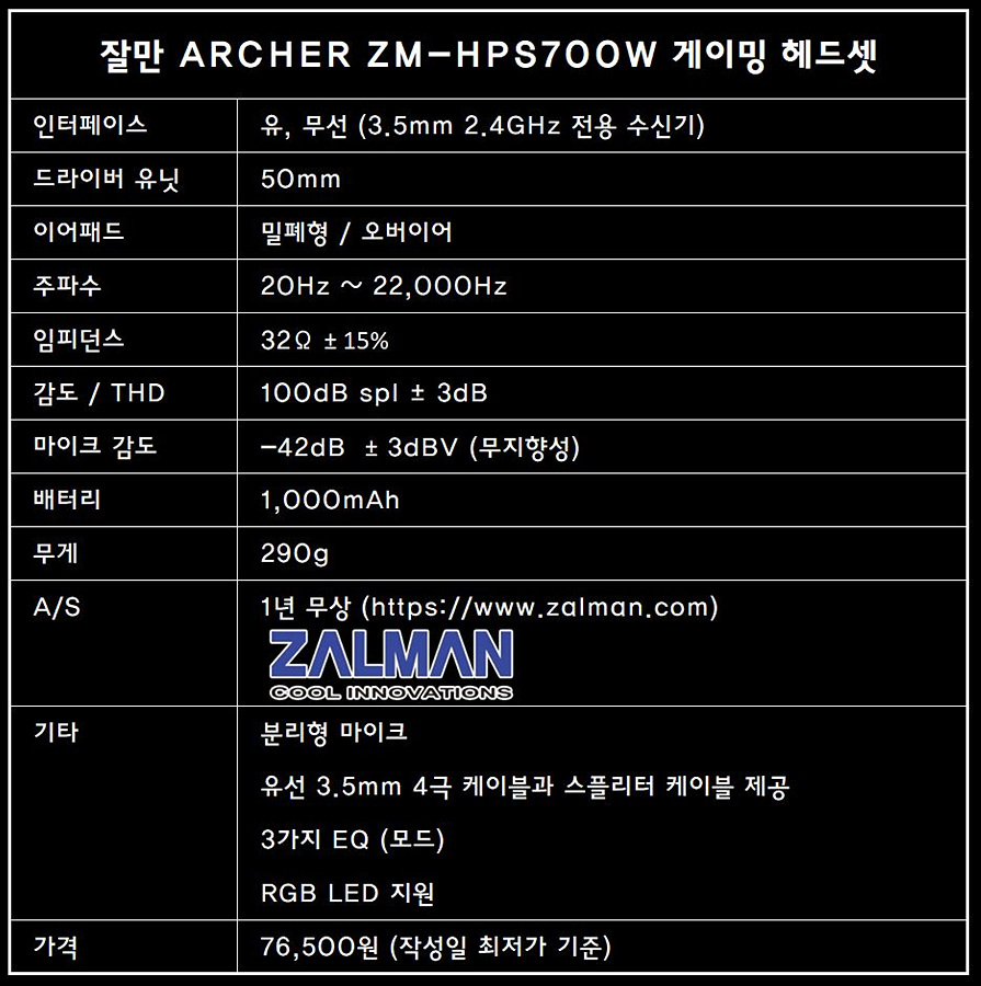 이번에 소개하는 ARCHER ZM-HPS700W은 잘만에서는 처음 선보이는 게이밍 헤드셋으로 그동안 출시해오던 쿨러, 케이스나 파워와는 전혀 다른 쪽의 제품입니다. 기존에 키보드와 마우스를 출시하고 있어서인지 게이밍 라인업을 모두 갖추기 위한 계획이라 생각됩니다. ARCHER 무선 헤드셋은 전용 수신기를 가지고 있는 무선 제품이지만 3.5mm 케이블을 통해서 유선으로도 활용할 수 있어서 PC와 스마트폰, 콘솔기기에서도 사용할 수 있습니다.