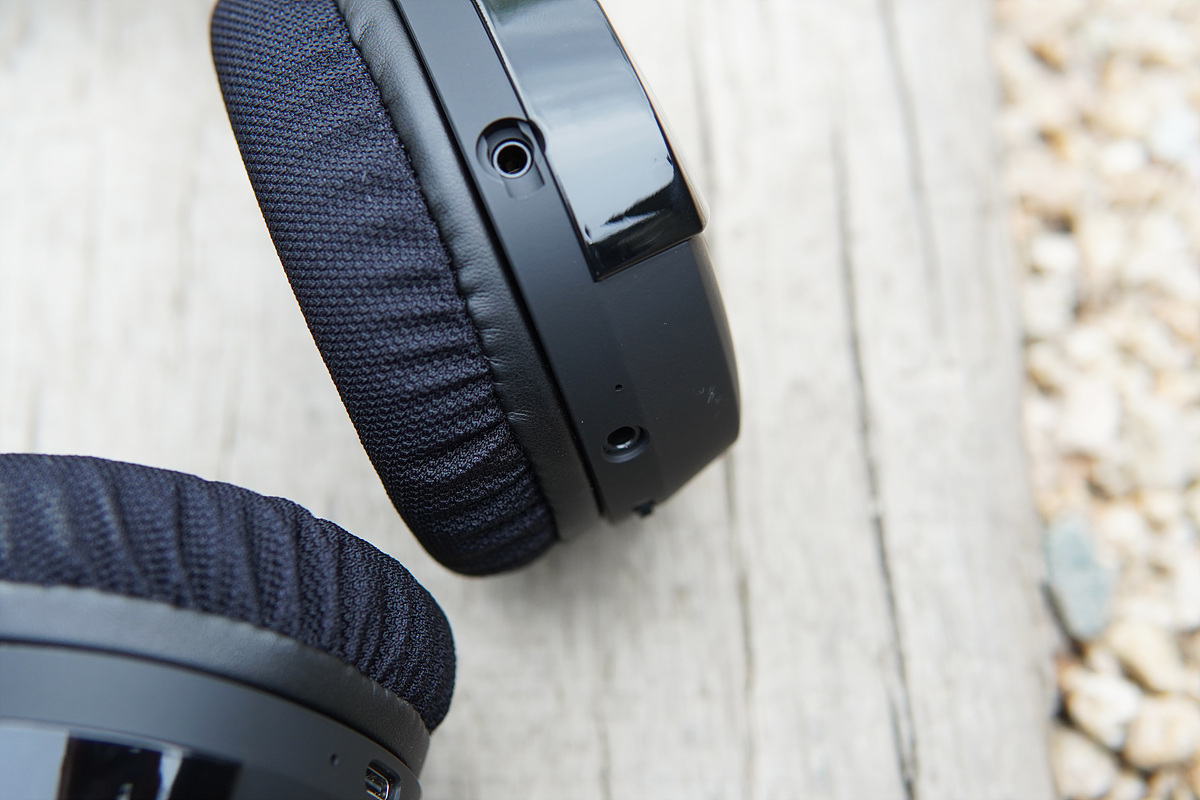 사용자를 기준으로 왼쪽 이어 컵에는 마이크와 유선 케이블을 연결할 수 있는 3.5mm 커넥터와 여러 가지 기능을 바꿀 수 있는 버튼과 볼륨 조절 다이얼이 있습니다. 위에서부터 전원 / 사운드 모드 / LED / 마이크 음소거 버튼입니다. 개인적으로 볼륨은 버튼식보다 다이얼 방식을 좀 더 좋아하는 편이라 좋았습니다.