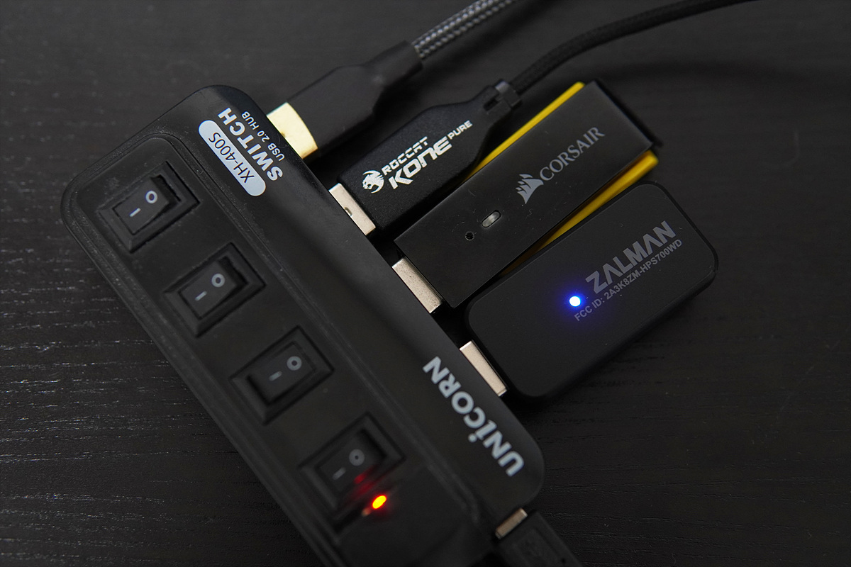 저는 USB 허브를 사용해서 입력 장치들을 연결하는데 잘만 Archer의 수신기는 세로 길이가 아닌 가로길이가 좀 큰 편이라 중간이 아닌 끝쪽에 있는 포트를 사용해야 되더군요. 끝쪽을 사용하더라도 사진처럼 공간이 부족해서 옆으로 삐져나오게 됩니다. 후속 제품이 나온다면 가로보다는 세로 길이를 늘려서 간섭이 없었으면 좋겠습니다.