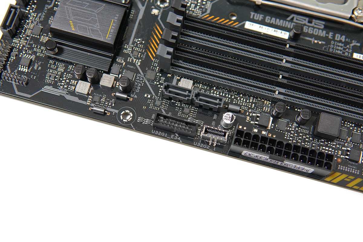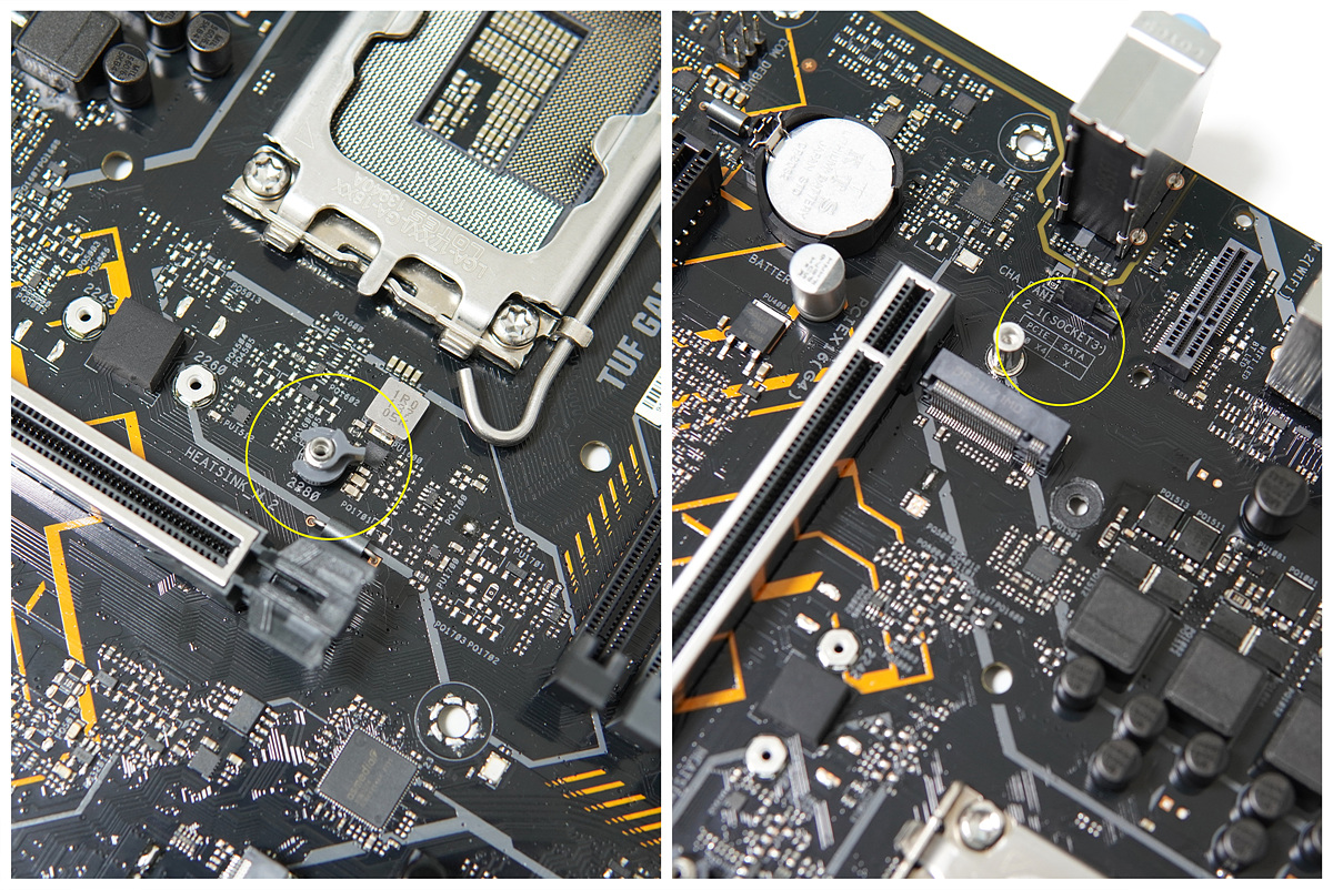 TUF Gaming B660M-E D4 메인보드는 두 개의 M.2 슬롯이 있으며 #1, #2 모두 PCIe 4.0 SSD를 사용할 수 있으며 #1 슬롯에는 방열판이 제공이 됩니다.