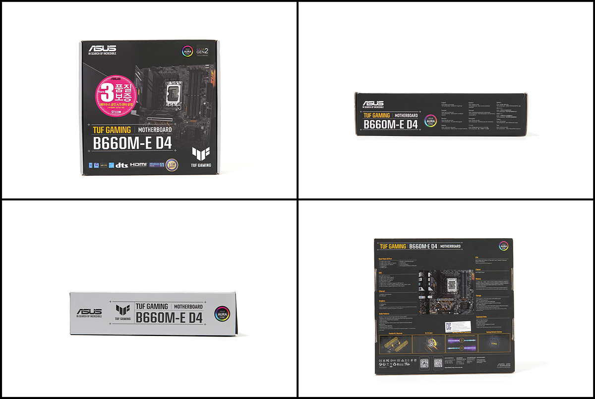 ASUS에서는 PRIME 라인업도 있지만 TUF는 PRIME과 조금 다른 몇 가지 부가기능과 감성으로 차별화를 하고 있으며 사용자들의 반응도 좋은 편입니다. 이번 시간에 소개하는 TUF Gaming B660M-E D4 보드 역시 이런 TUF 감성을 느낄 수 있는 제품입니다. mATX 폼팩터를 가지고 있으며 제품의 이름에서 알 수 있듯이 DDR4 메모리를 사용하고 있습니다. 보드의 레이아웃이나 사용된 칩셋과 함께 어떤 부가기능들이 있는지 자세히 살펴보도록 하겠습니다.