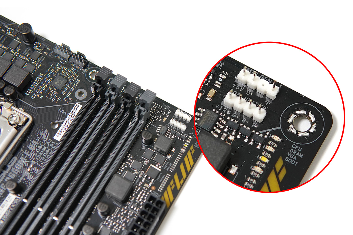 메모리 슬롯 옆에는 +5V ARGB / +12V RGB 핀 헤더가 있으며 그 옆쪽으로는 시스템의 이상 유무를 확인할 수 있는 Debug LED가 있습니다. 시스템이 처음 시작이 되면 CPU / DRAM / VGA / BOOT 순서로 체크를 하고 이상이 있는 부분에 LED는 계속 켜져 있으며 정상적으로 동작이 되면 LED는 꺼지게 됩니다. Debug LED는 조립에 능숙한 사용자뿐만 아니라 익숙하지 않은 분들에게도 정말 유용한 기능입니다. 이게 없는 시스템에서는 어떤 게 문제인지 하나하나나 테스트를 해봐야 돼서 문제를 파악하기 힘들 뿐 아니라 시간도 상당히 오래 걸리게 됩니다.