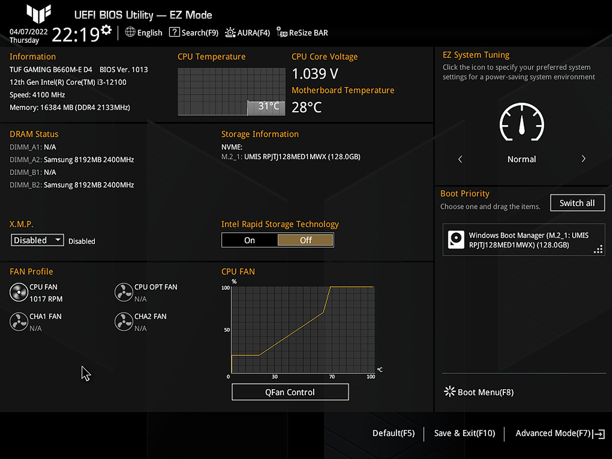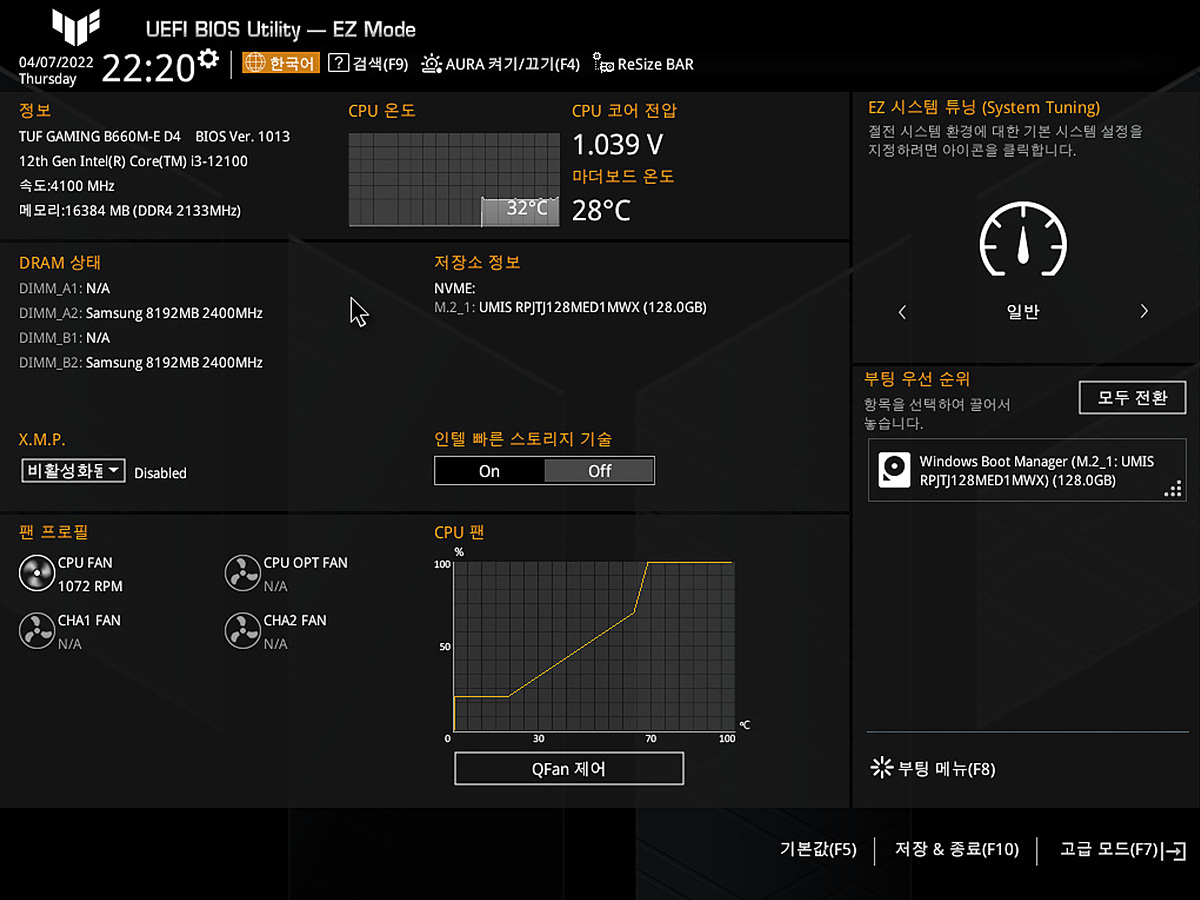 F7을 눌러서 고급 모드로 바꿀 수 있습니다. 개인적으로 ASUS 메인보드를 가장 오랫동안 사용해서인지 이 메뉴가 가장 친숙하고 편하더군요. ^^